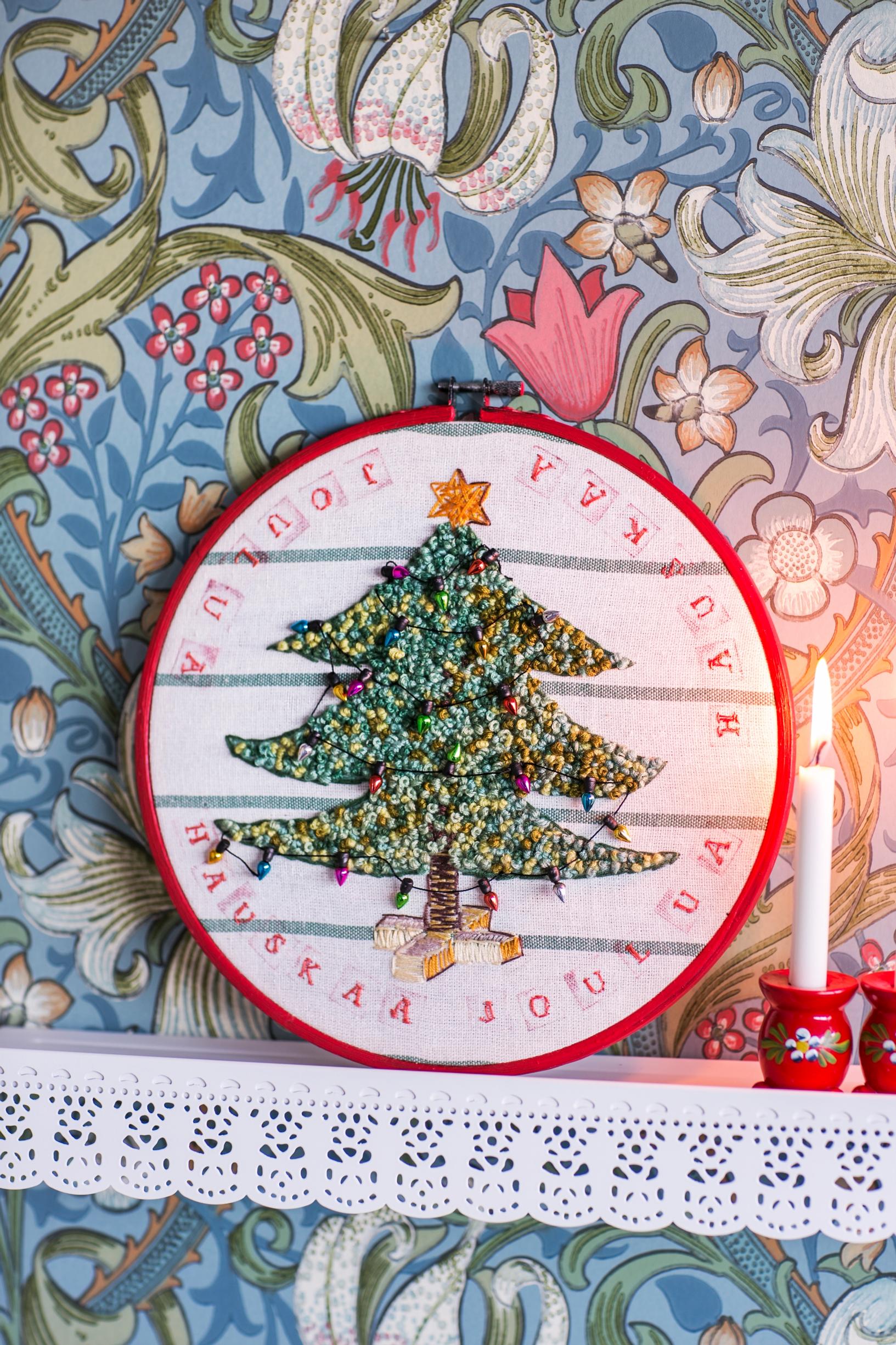 An embroidered piece finished with lights is a joy to showcase every year at Christmas. Sketch the motif on fabric and stitch the pattern using satin and knot stitches.