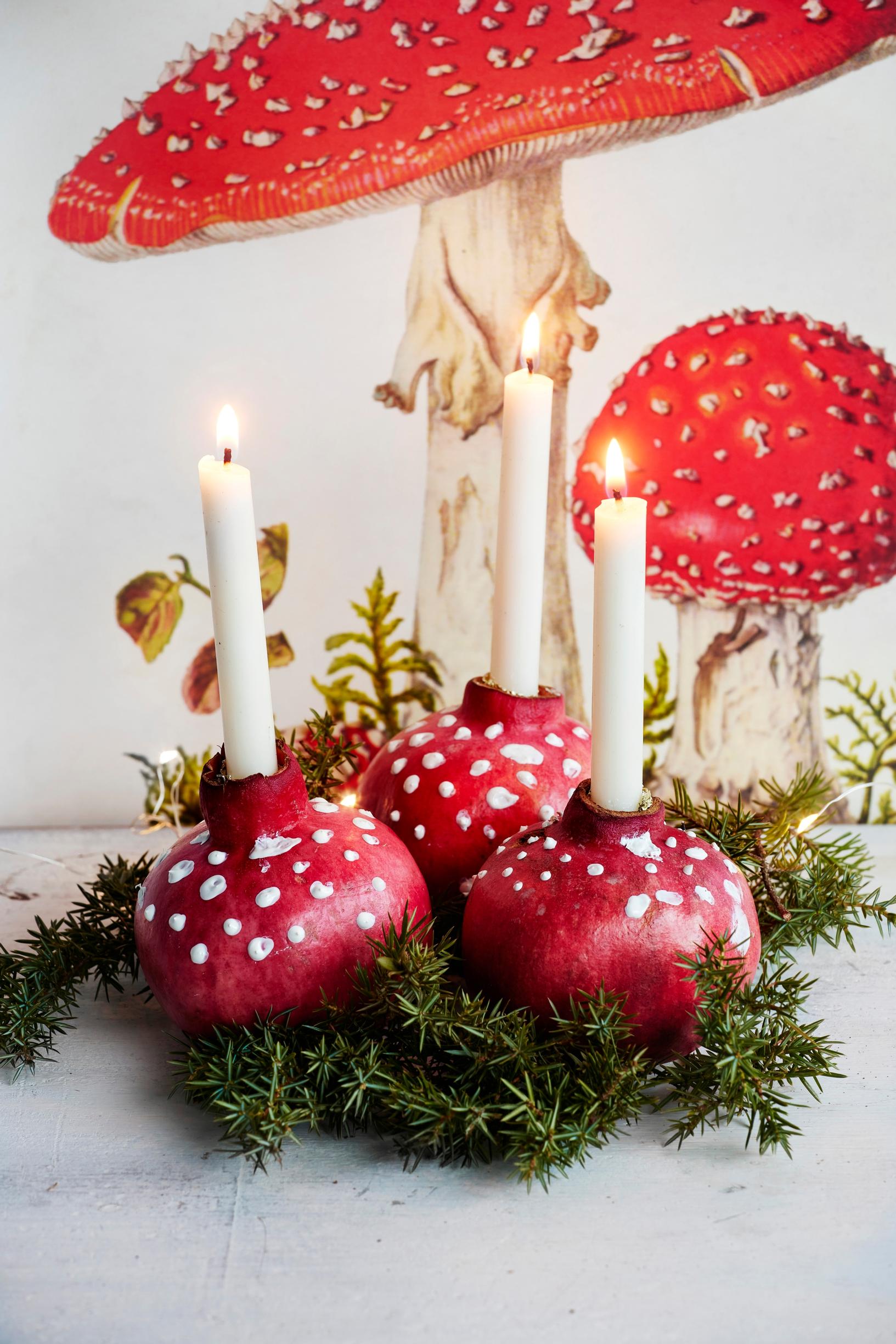 Use candle paint to add white dots to pomegranates, and set candles into them. You can also paint red apples to match the look. Never leave a burning candle unattended.