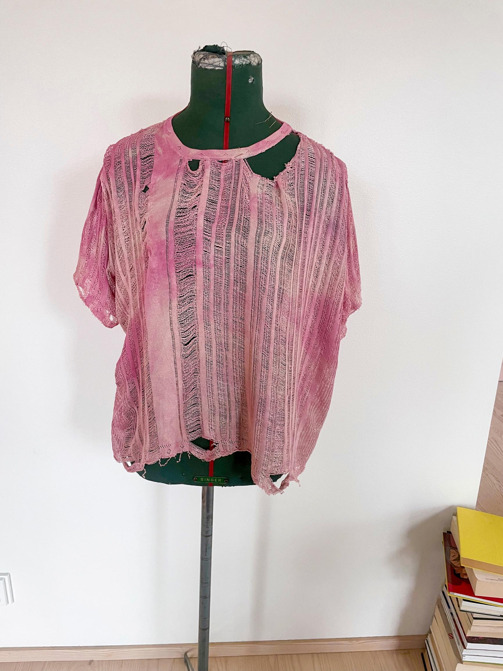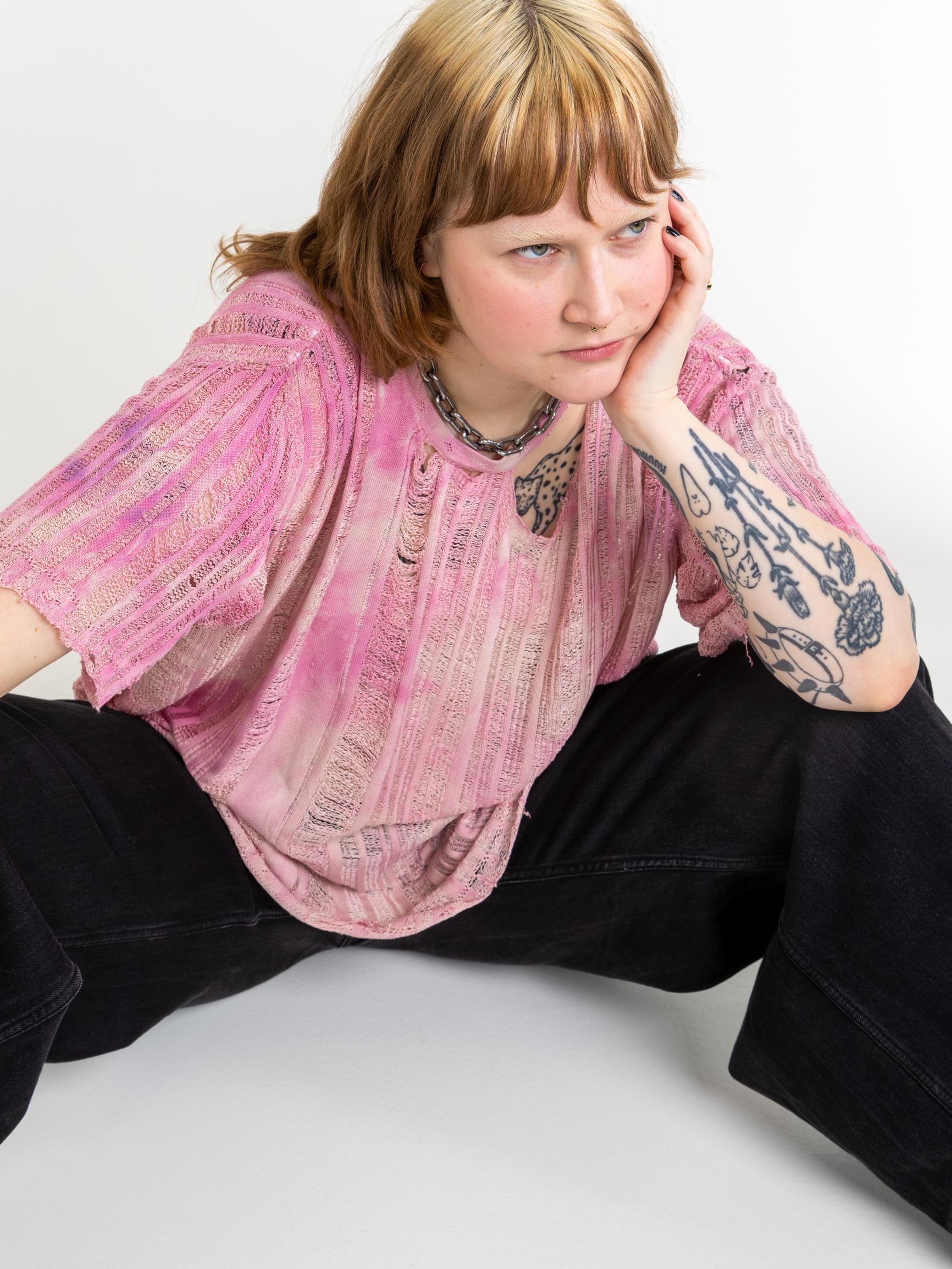 Try pushing your limits with larger holes and more unraveling—maybe around the hem or neckline. Asymmetrical details add personality to your garment. It can be fun to move beyond a tidy, uniform finish.