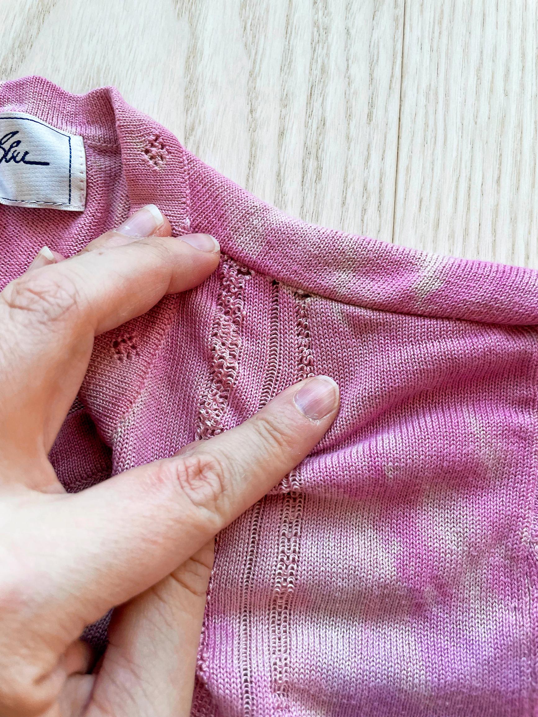 - You’ll need a fabric dye suitable for your material, plus salt, soda, and a pot for dyeing. Measure all ingredients per the fabric dye instructions. Tie the garment loosely with thread, but tight enough to keep it from coming undone in the dye bath. Thoroughly wet the knit beforehand—ideally, soak it a bit. Dye according to the instructions on the dye packaging. Finally, wash the knit.