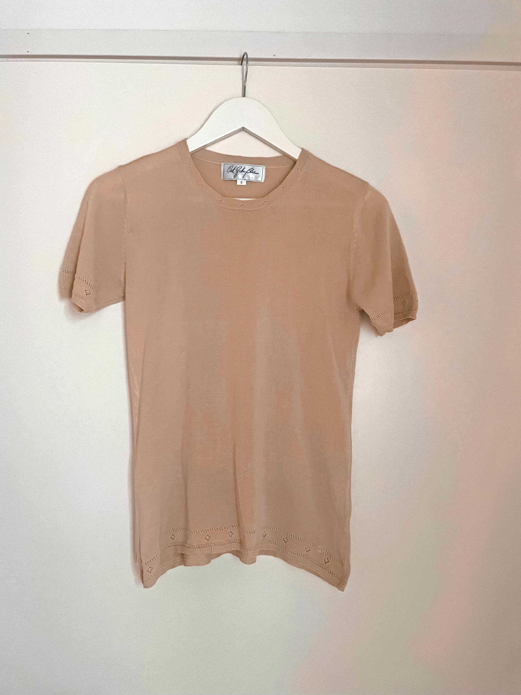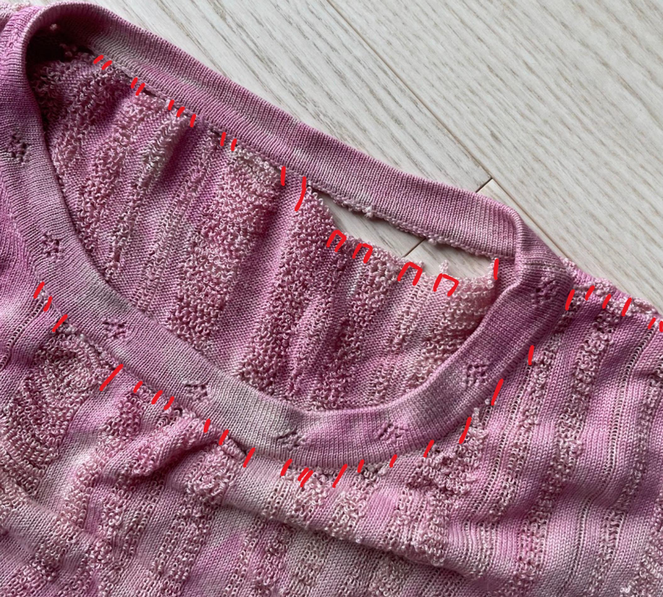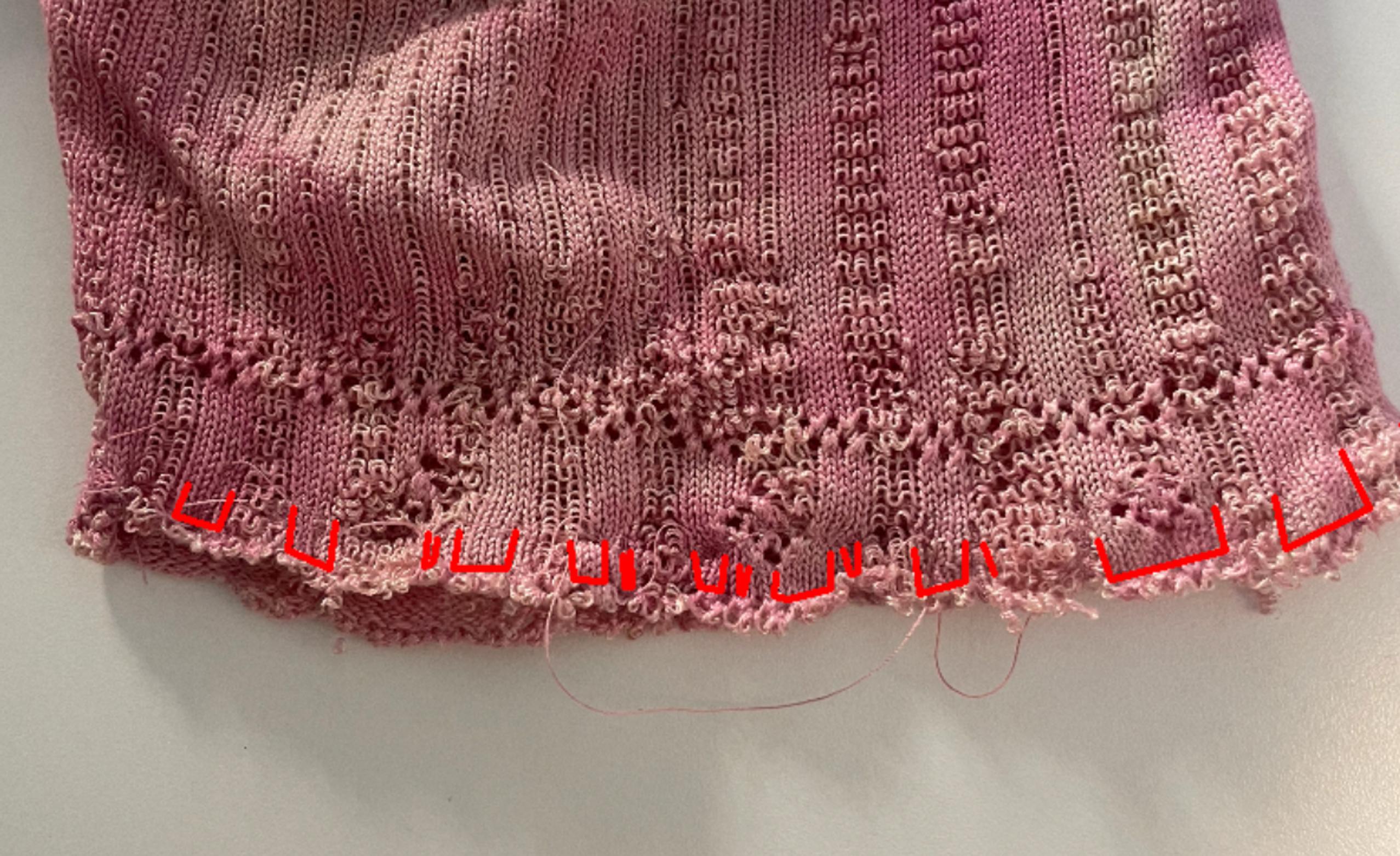 - Be cautious that stitches don’t unravel where the yarn was cut at the top. If the material is slippery and the stitches threaten to run, secure cut threads on the sewing machine as you go. In a fine knit, always leave at least three adjacent intact stitches between the cuts.