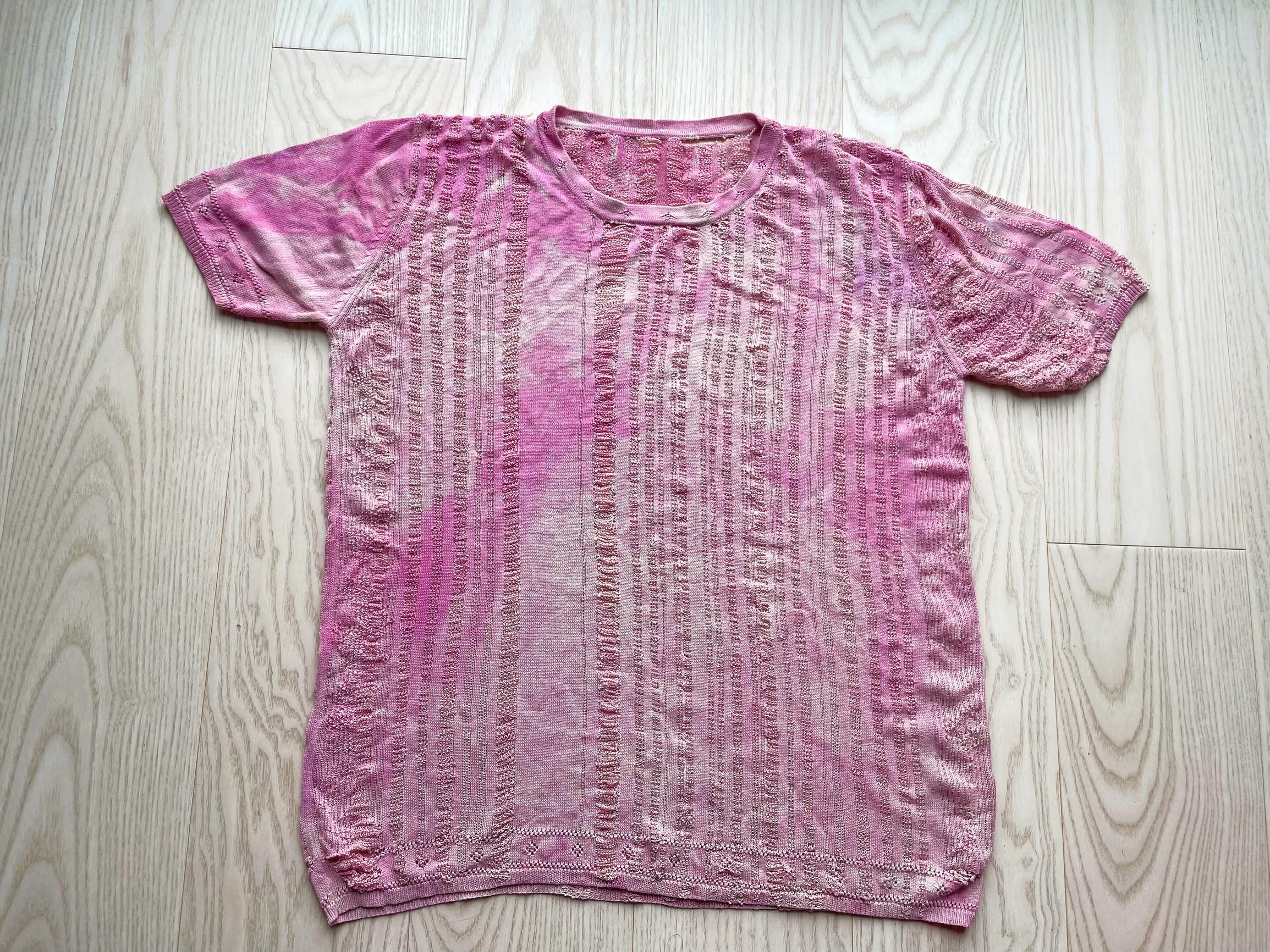 “In these instructions, you’ll learn how to unravel a garment directly without having to open any seams. With this method, the seams remain their original size and don’t expand, even though the unraveled area becomes wider and longer. I also dyed the sweater to cover stains and faded color. You need to know how to stitch a straight seam on a sewing machine and recognize a stitch in knitting.”