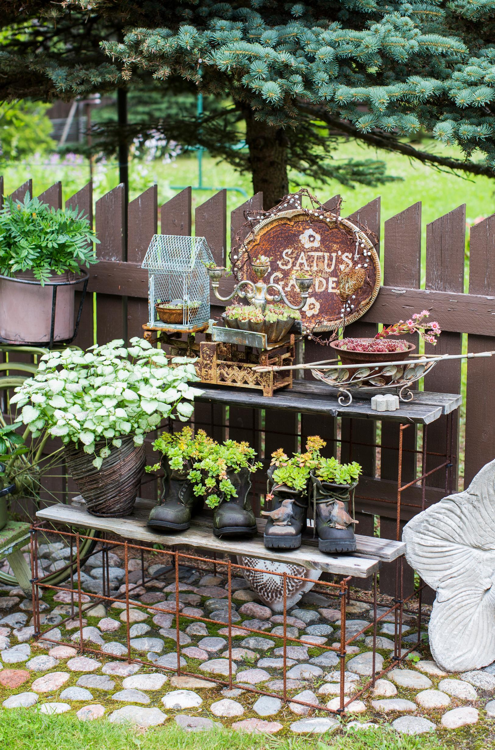 A two-level shelf made from reinforcement mesh and a few short planks can hold a fun assortment of plants. Old shoes and cake pans serve as quirky pots.