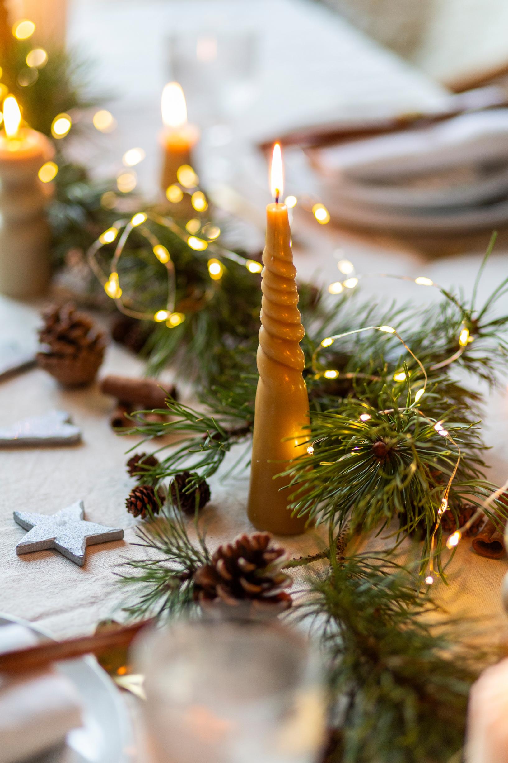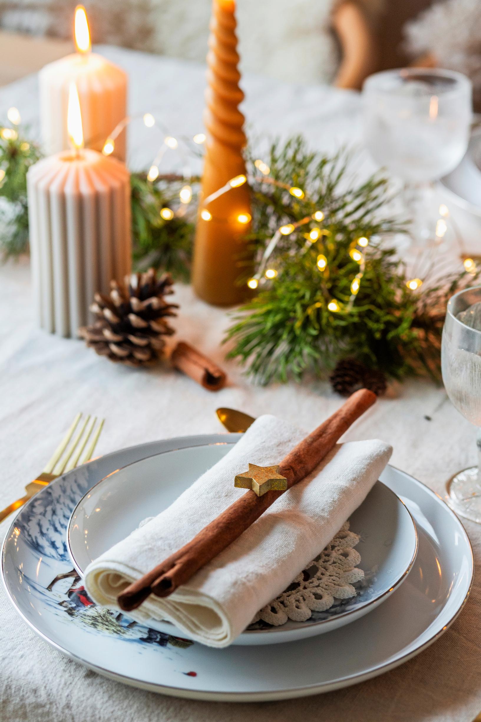 Year after year, I gravitate toward dark green, deep red, and gold. The way I set the table changes annually: sometimes it’s lavish and abundant, while other times I just add evergreen branches, candles, and small wooden or brass trees. Recently, I’ve been fond of lightweight paper decorations that are easy to store.