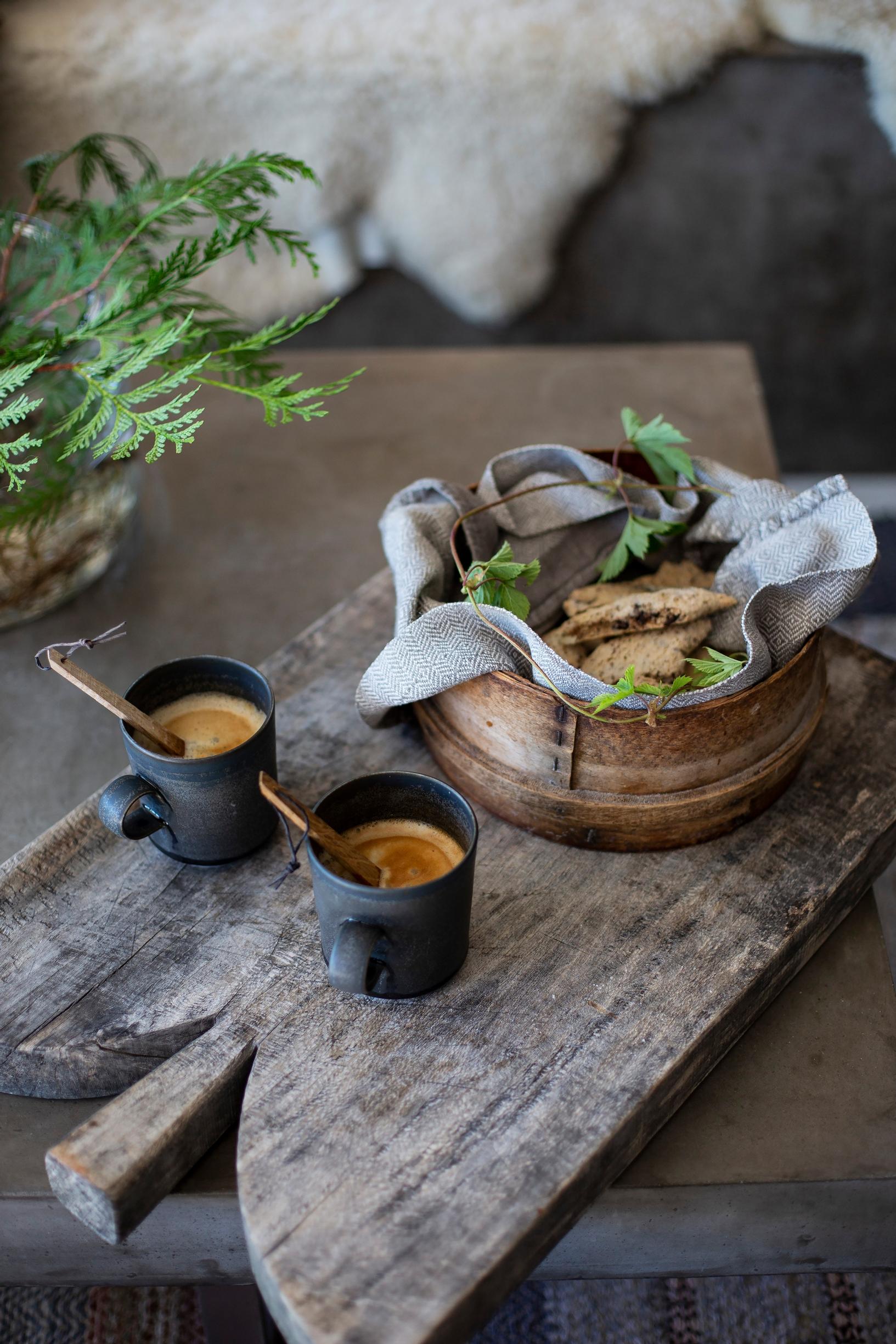 The kitchen furnishings are entirely recycled, and every detail is carefully considered. Benita has made their potholders by hand, as well as the wooden spoons she has set on the table for afternoon coffee, served with the house specialty—a porridge bread topped with butter and syrup plus a hint of cardamom.