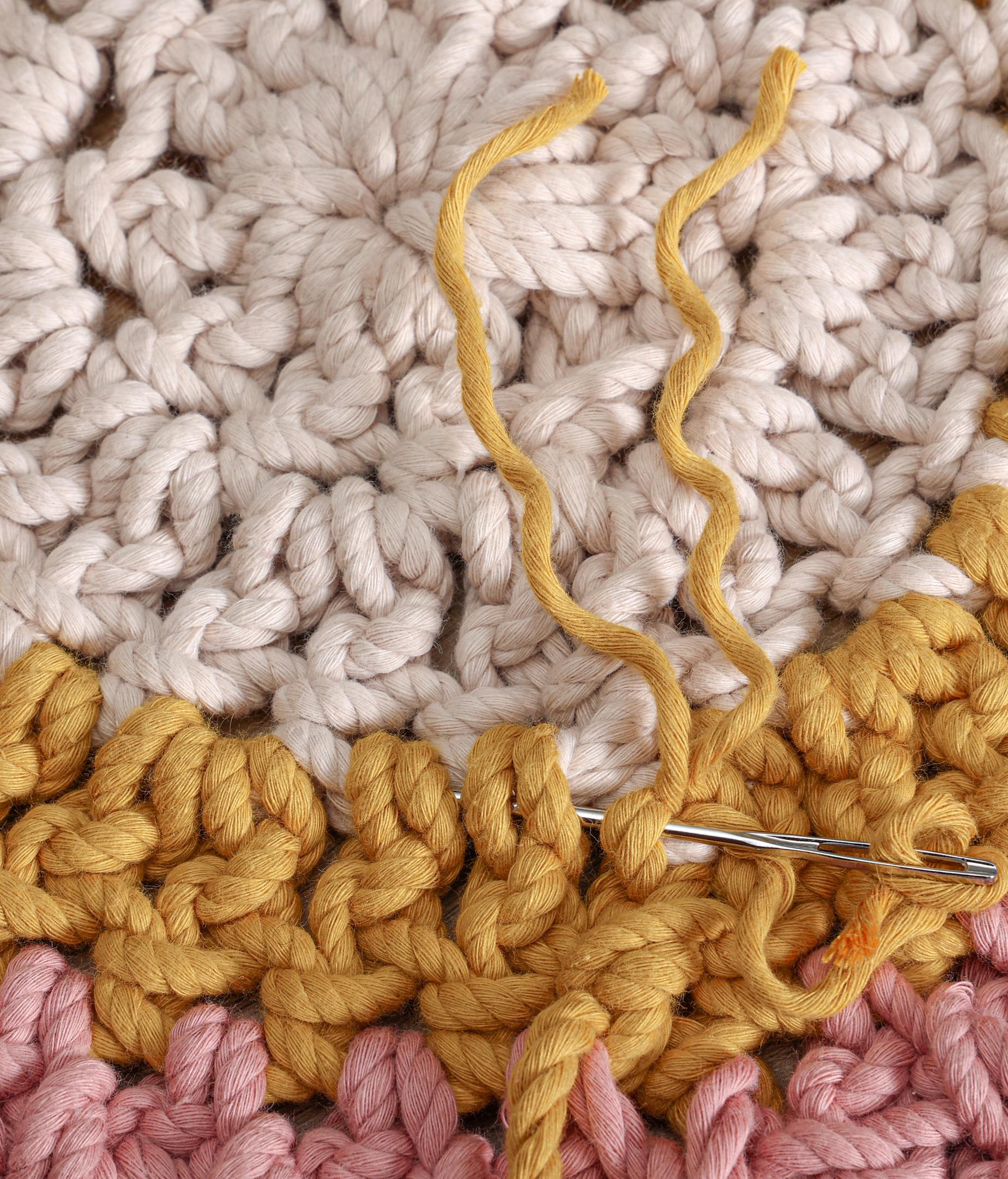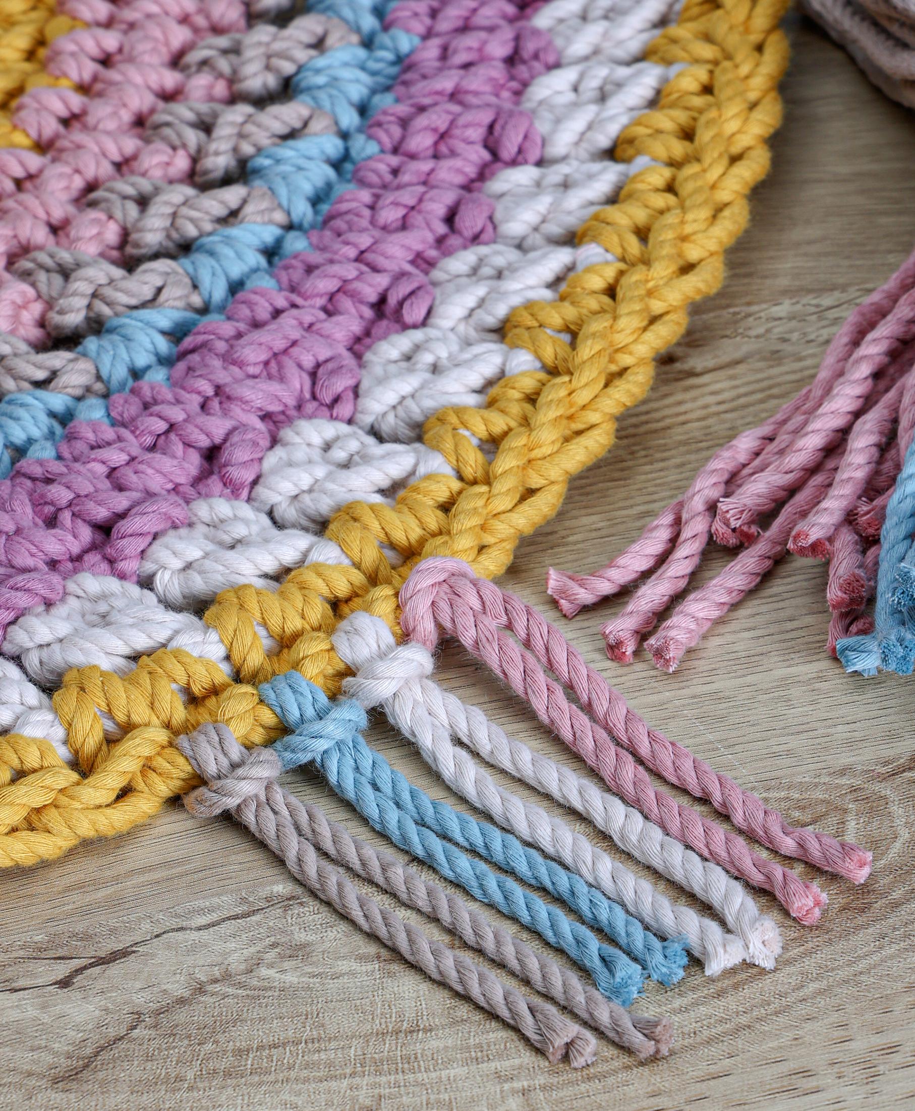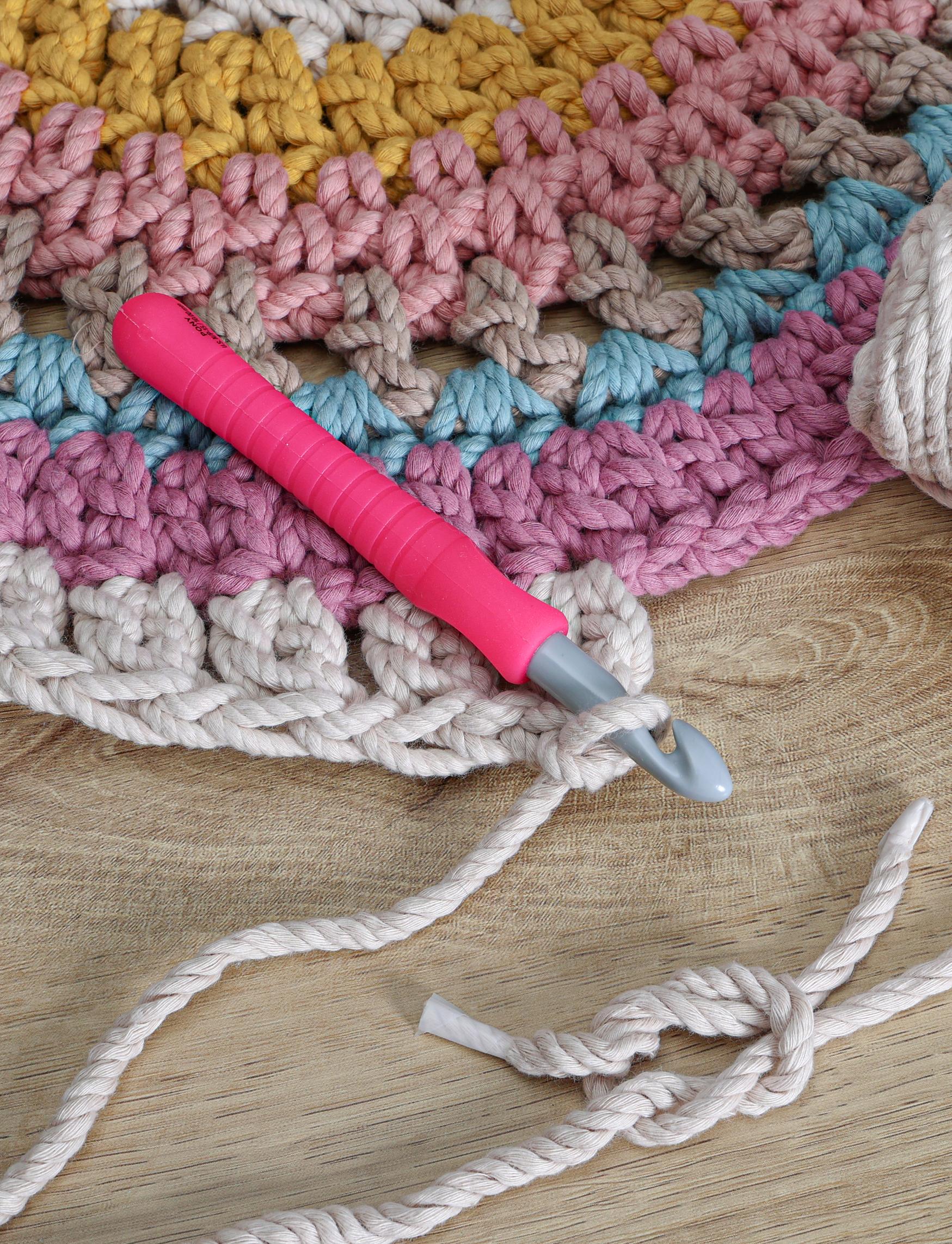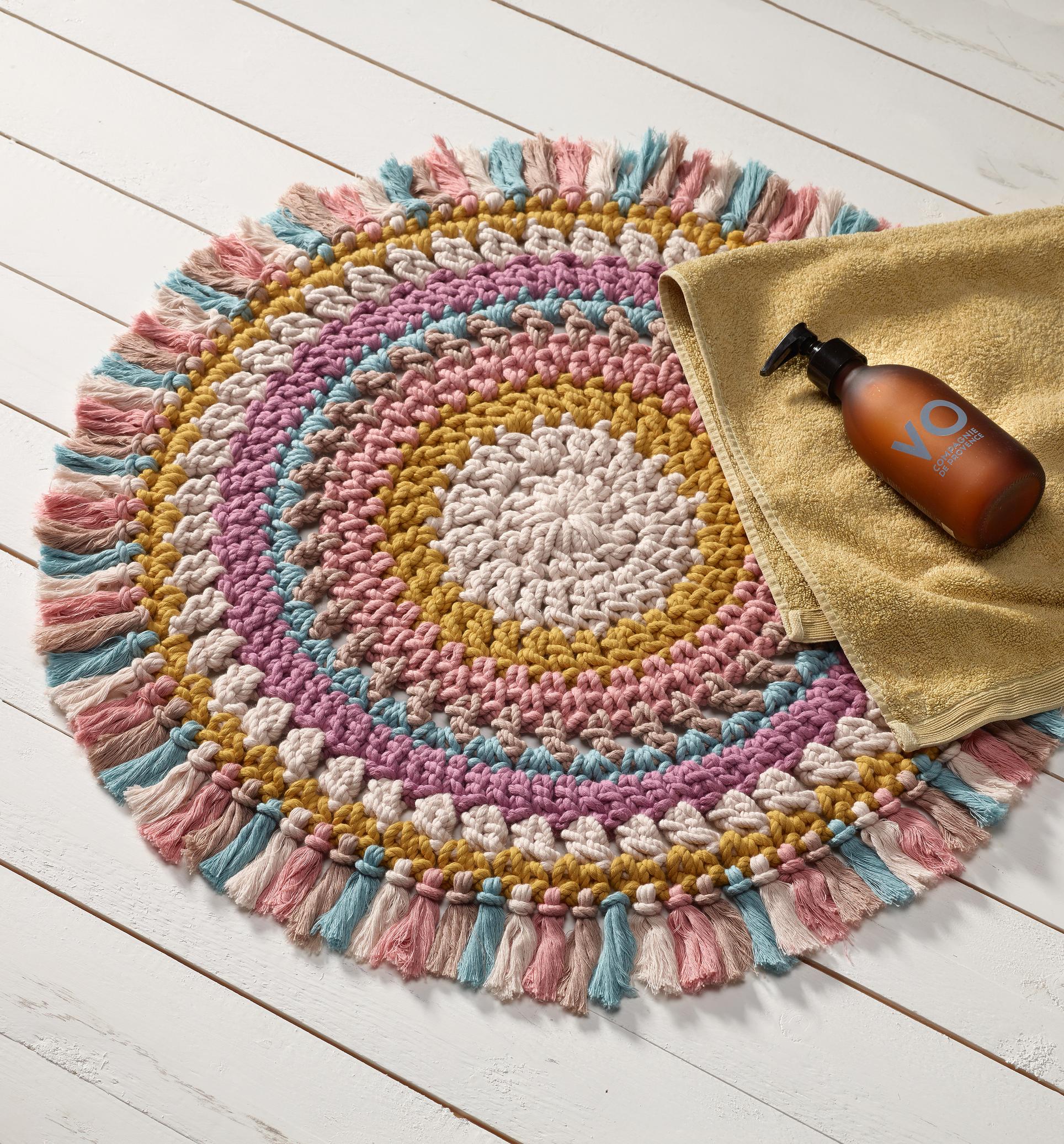 Crocheted with a large hook and soft yet sturdy cotton macramé cord, this small round rug works up in no time. It’s ideal for tight spots such as the kitchen, entryway, or even as a bathroom mat.