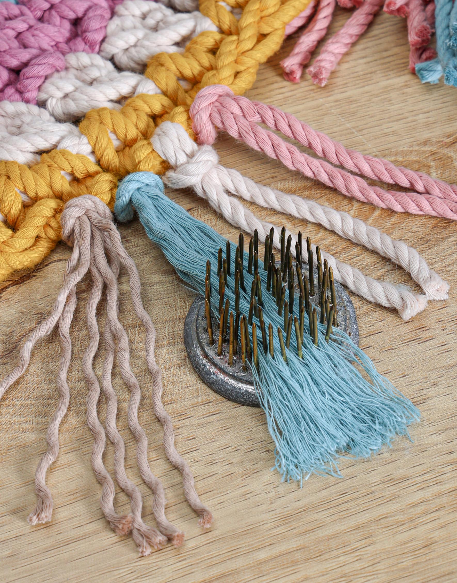 Untwist the strand ends and brush them out with a suitable brush or comb. If you’d like a shorter fringe, trim before separating the plies.