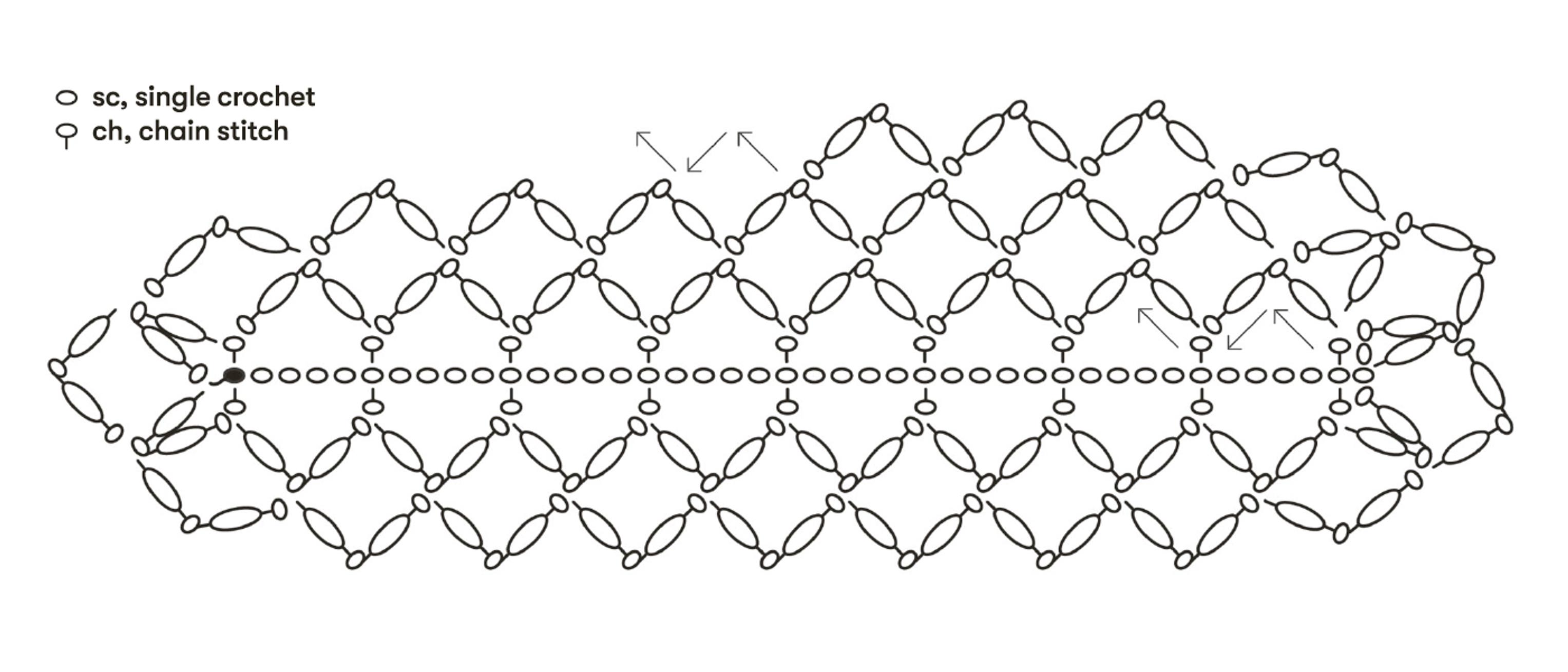Ch 43 for the foundation chain. Make a seamless bottom by crocheting Solomon’s knots (SK) on both sides of the foundation chain according to the chart.