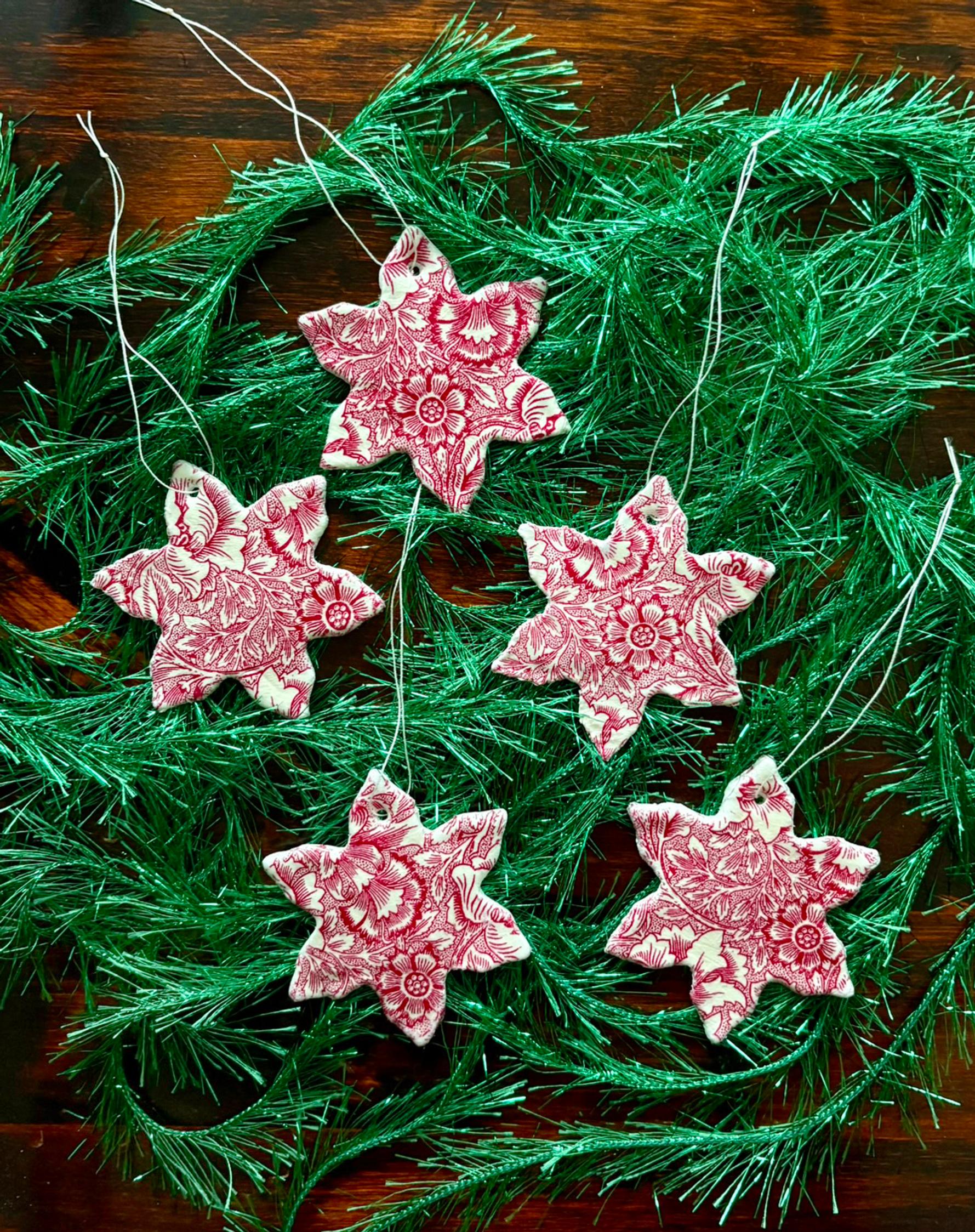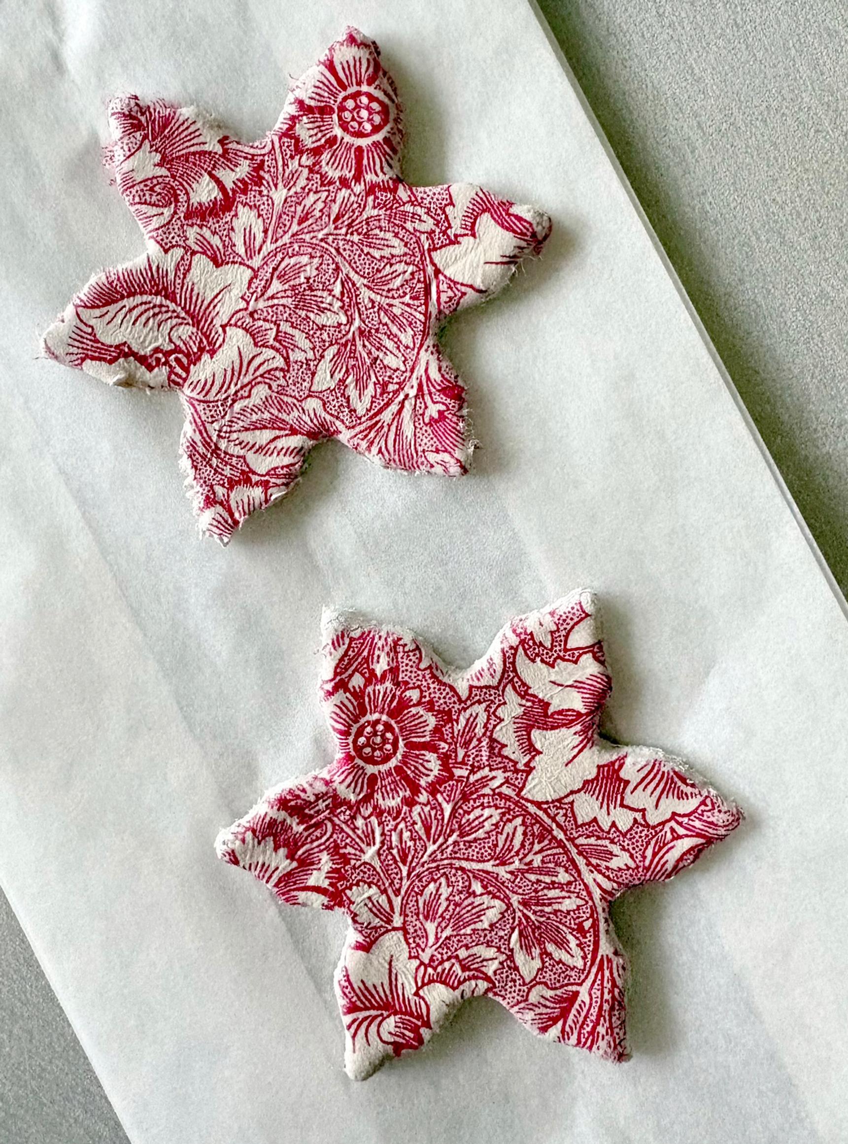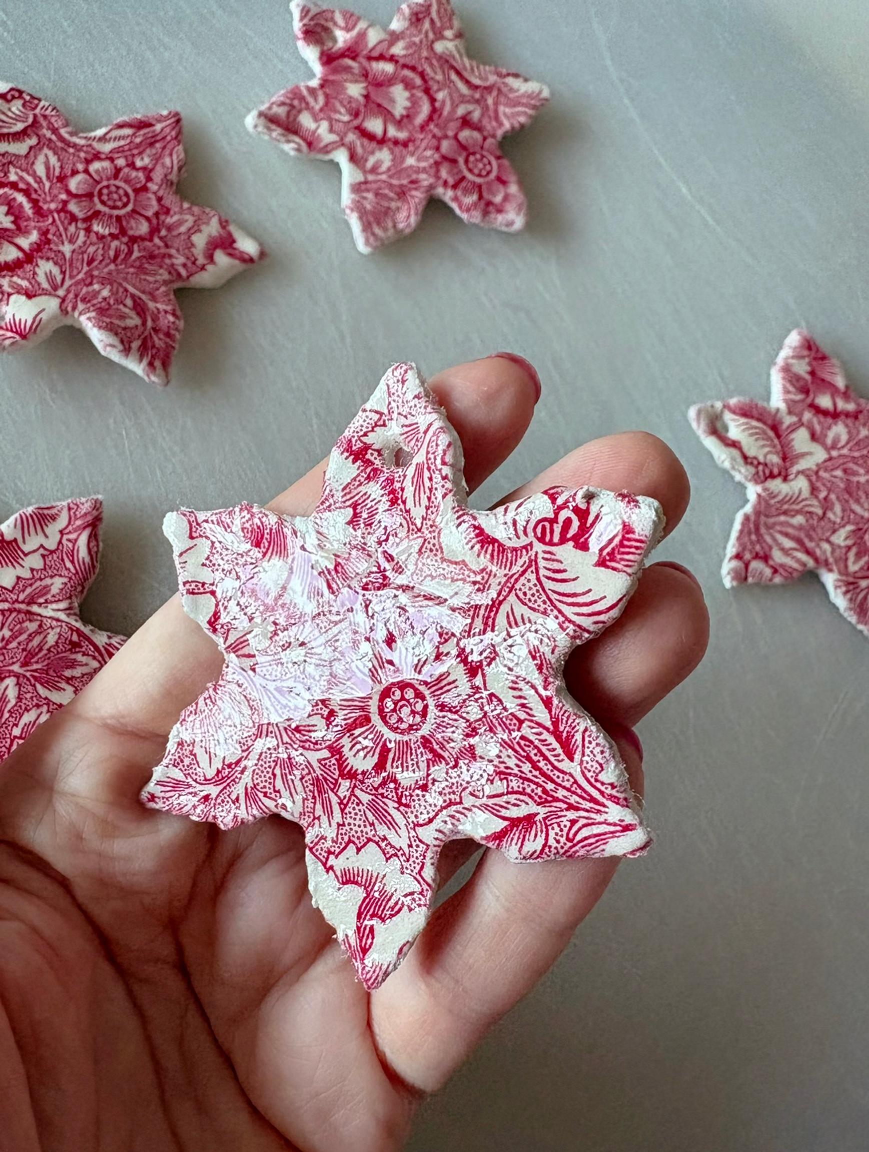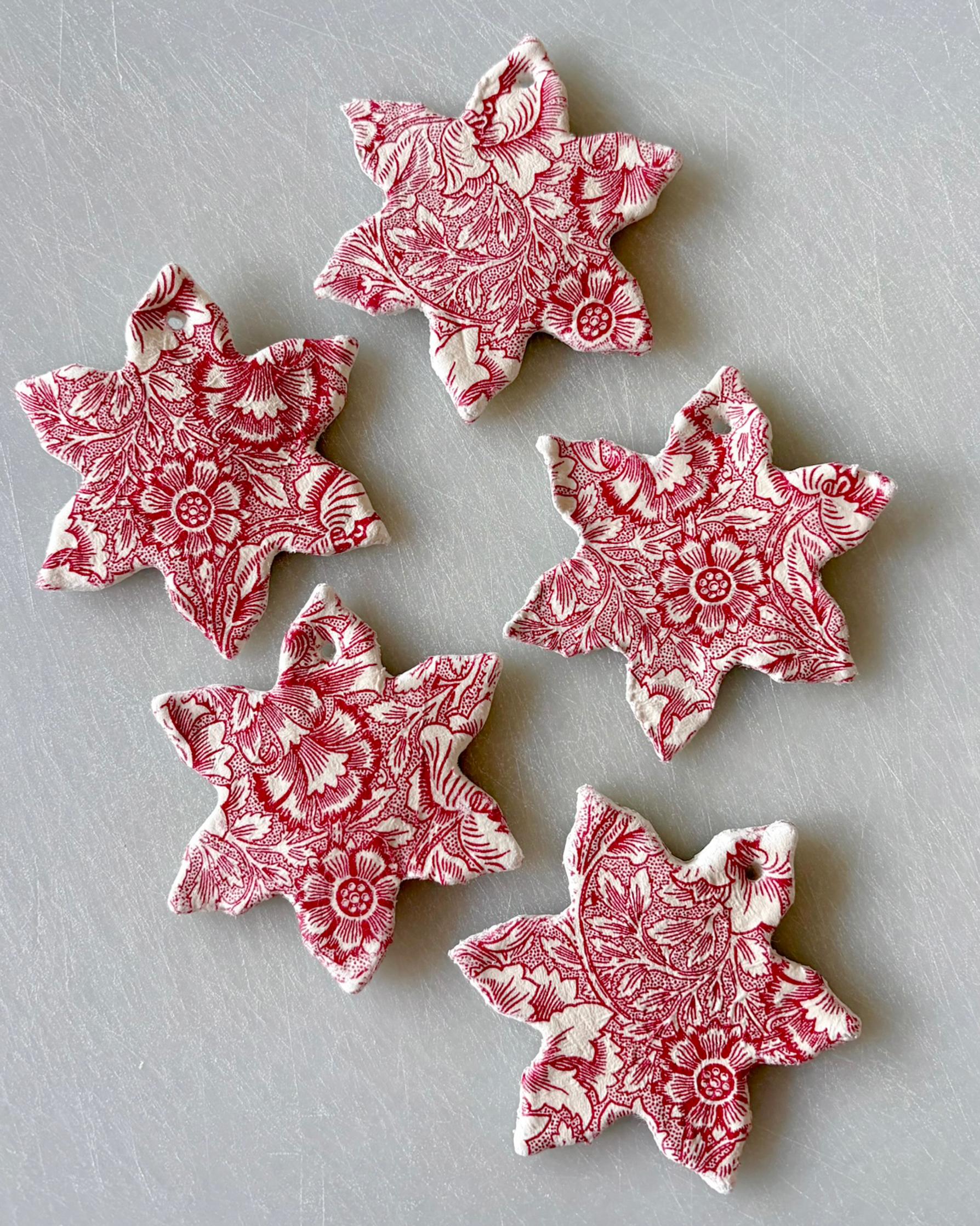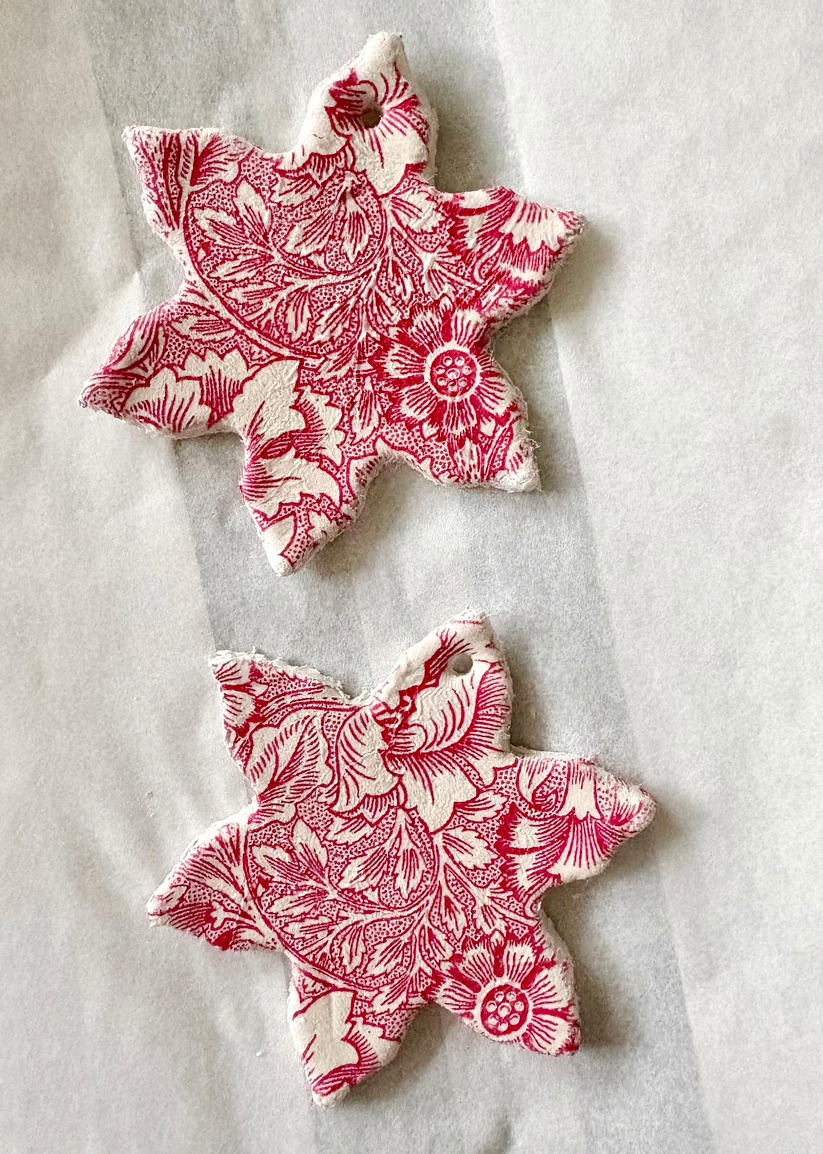 Make air-dry clay star ornaments—a napkin prints the pattern, a cookie cutter shapes them