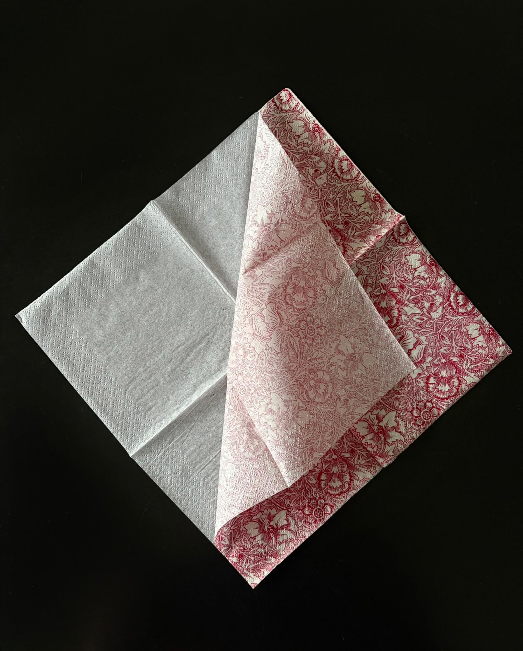 2. Separate the top layer of the paper napkin. Fold the napkin in half.