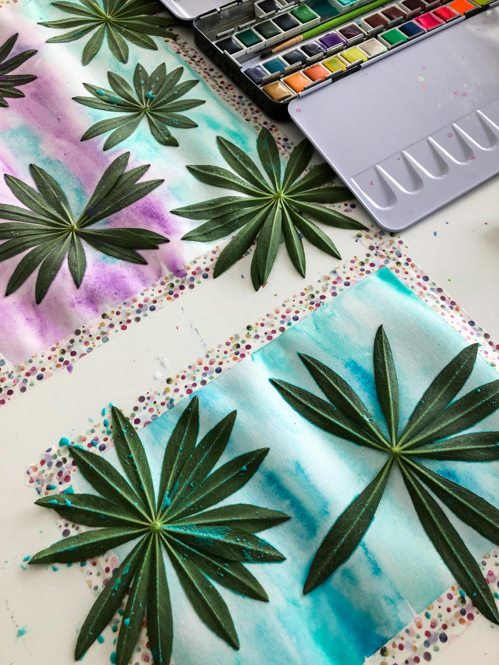 Sun printing is a fun and easy technique for all ages. Paint your paper, place plants on the wet surface, and let the light do the rest. As it dries, the watercolor recedes from under the leaves, creating a beautiful leaf pattern.