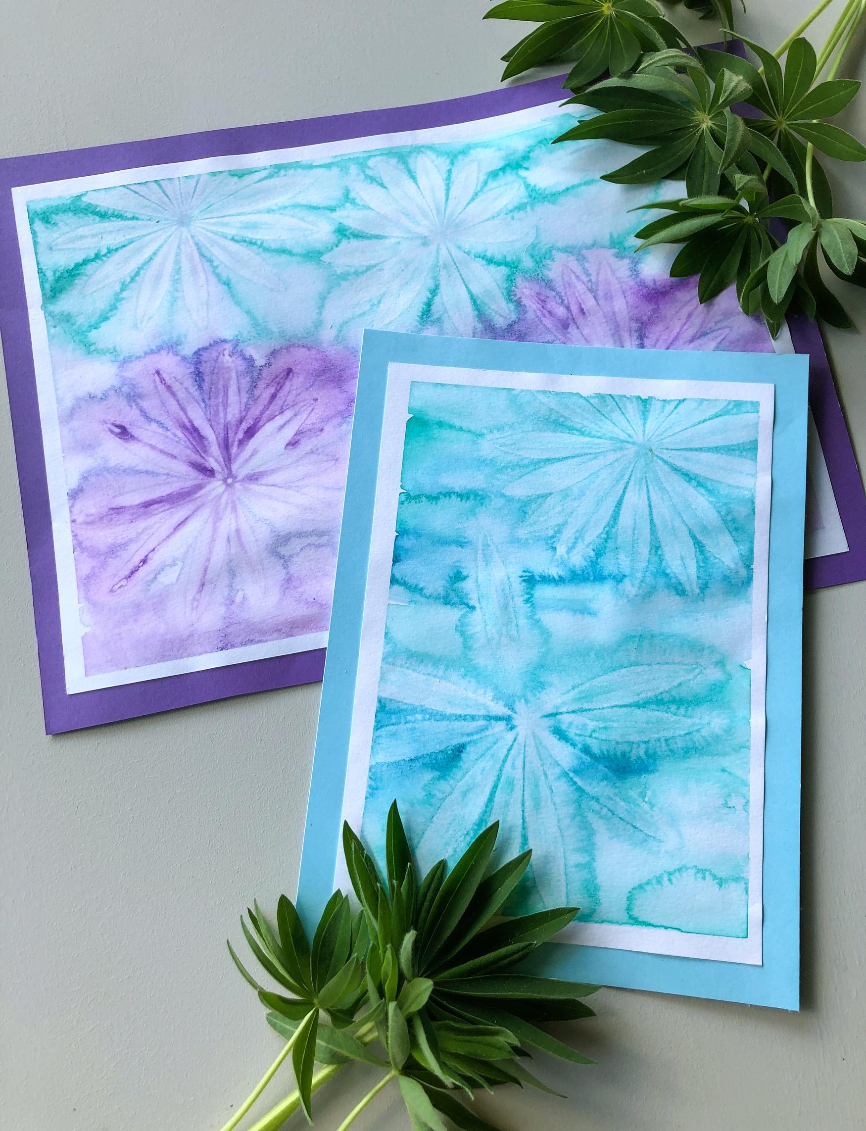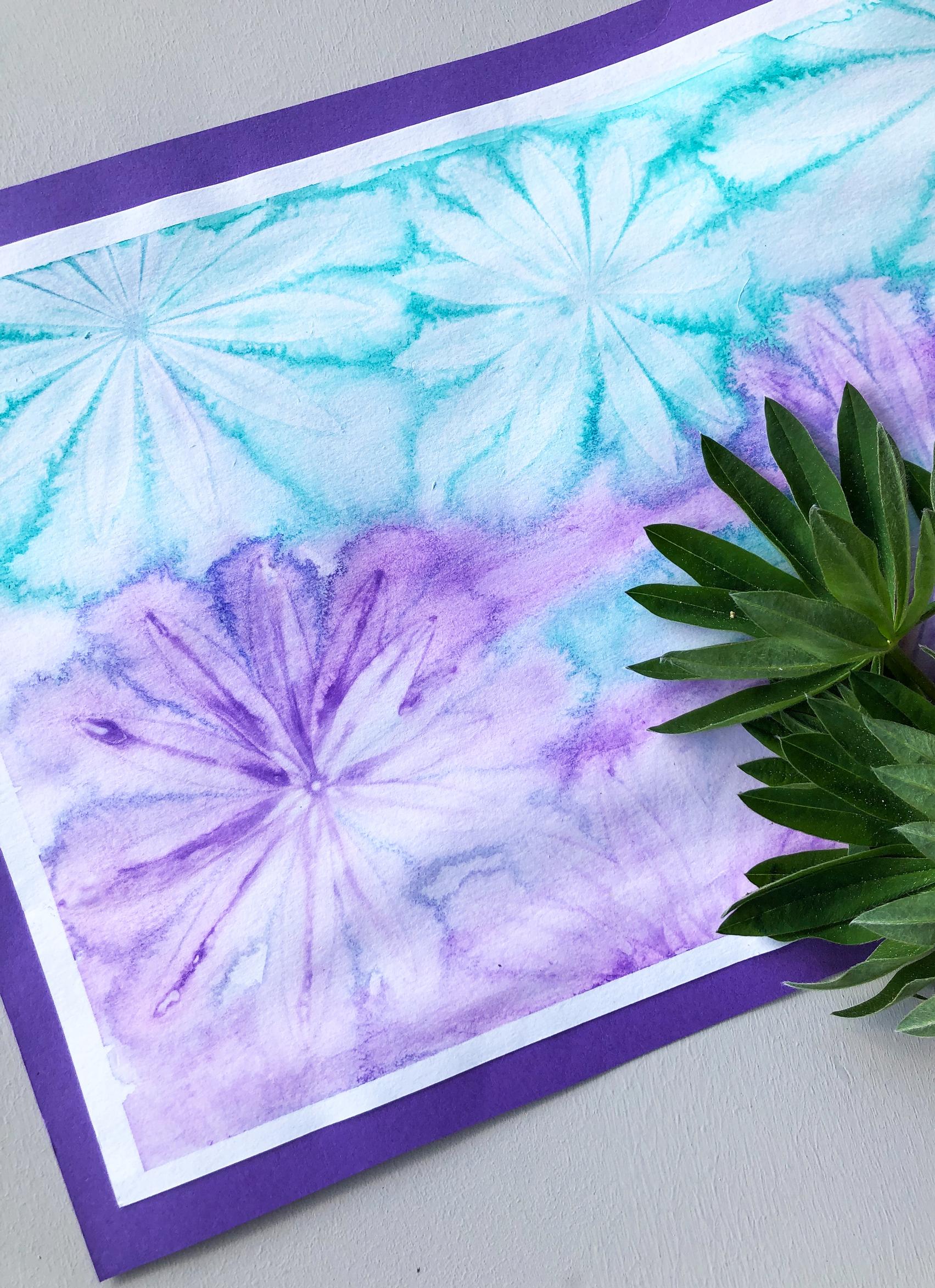 Sun printing is a patterning technique done on paper. It’s based on the idea that paint dries differently under non-absorbent shapes. Despite the name, you don’t actually need the sun, but it does speed up drying. Try sun dyeing on fabric, too! Instructions for sun-dyeing fabric
