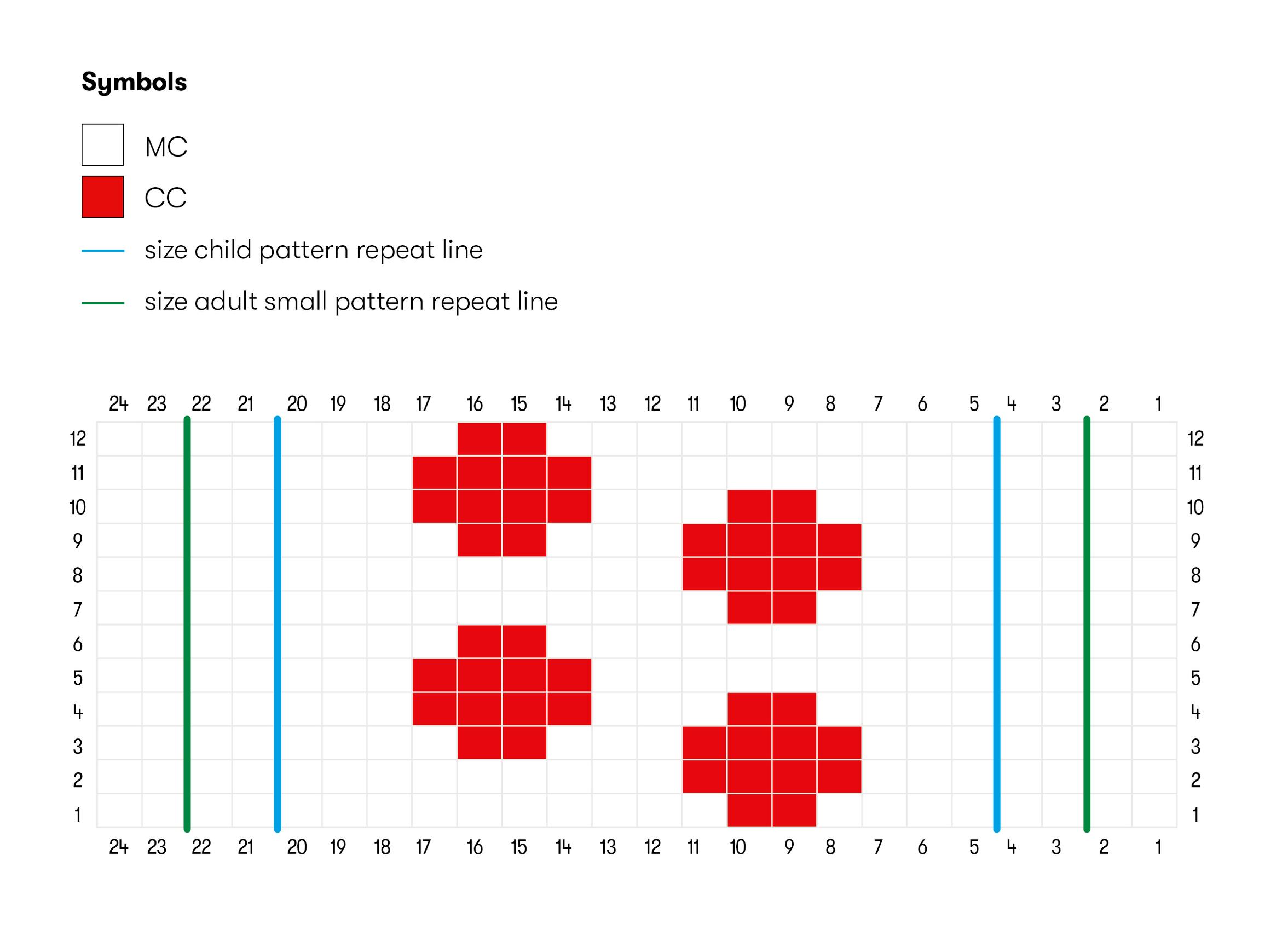 Start following the chart in the beginning of N2, attaching CC and starting from column 5 (3) 1 (see the lines in the chart), and continue following the chart on N3 until column 20 (22) 24. Follow the chart on N2 and N3 until the mitten measures 5.5 (7) 8 cm / 2.25 (2.75) 3.25˝ from the ribbed cuff.