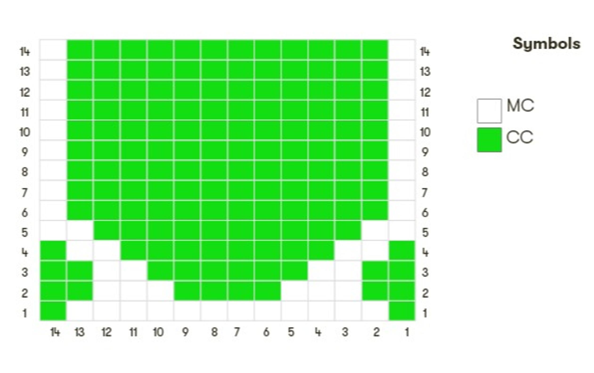 Attach CC and start working the colorwork pattern following the chart. Follow the chart starting from the lower right corner and going up row by row. Work chart rows a total of 9 (10) 11 (12) 13 (14) 15 (16) 17 (18) times per each rnd.
