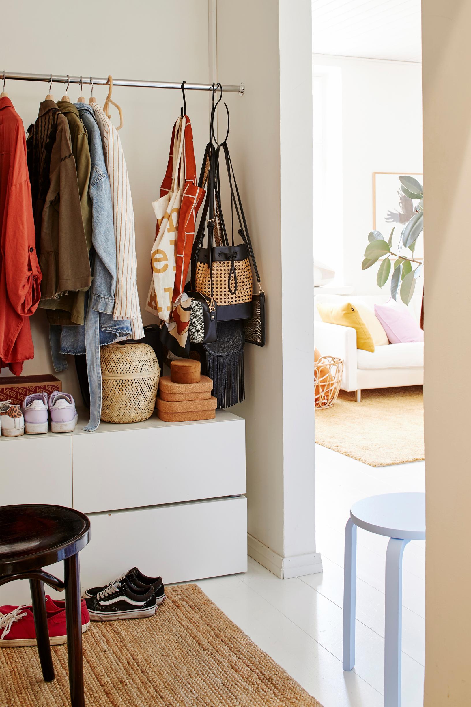 3. A hanging rail or rack is convenient and keeps the hallway feeling spacious