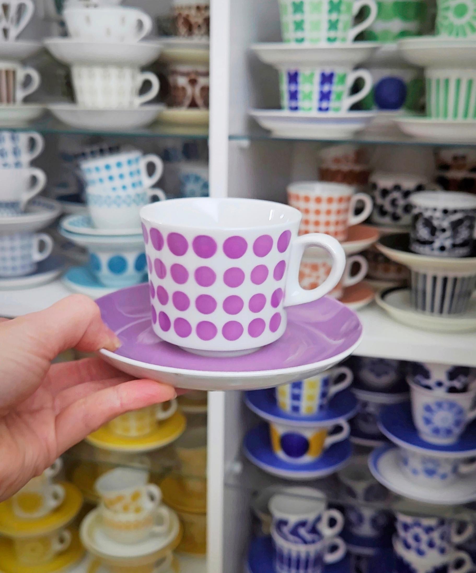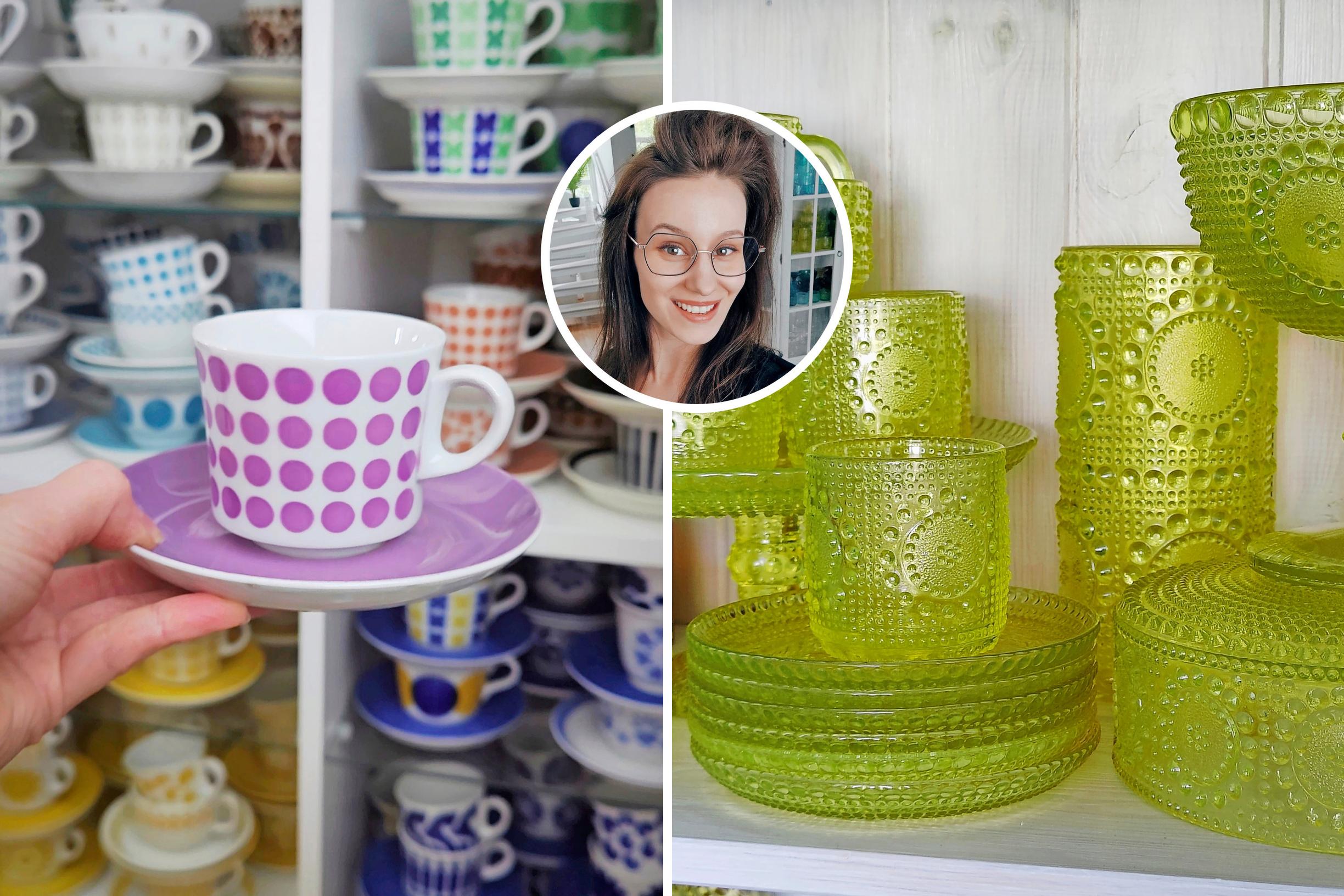 Kouvola-based 36-year-old Kia Peltonen’s collection of Arabia’s spray-painted cups gets daily use, yet she carefully guards one special purple cup. She spent seven years deciding whether to buy it. She also picks up other dishware and home décor items from flea markets.
