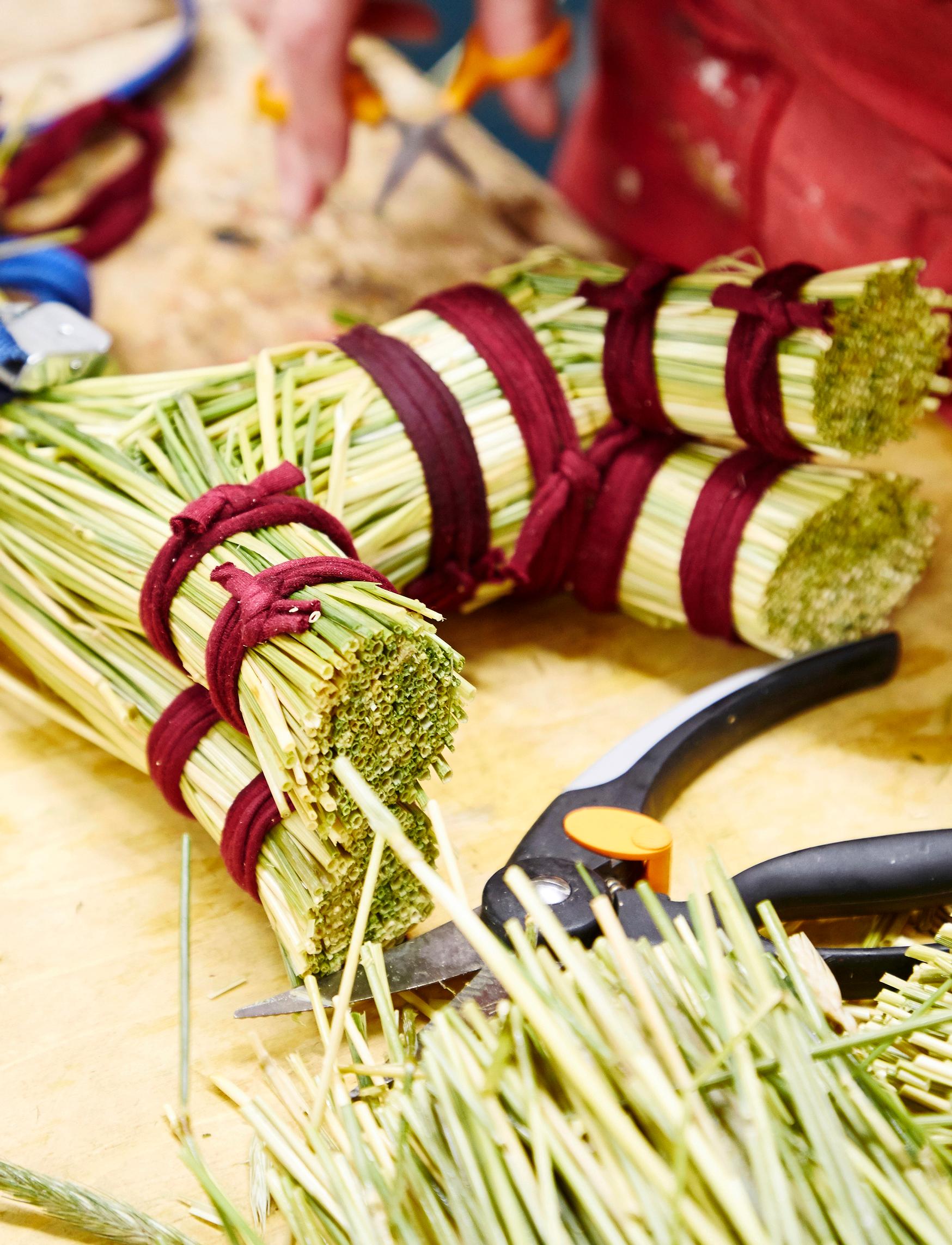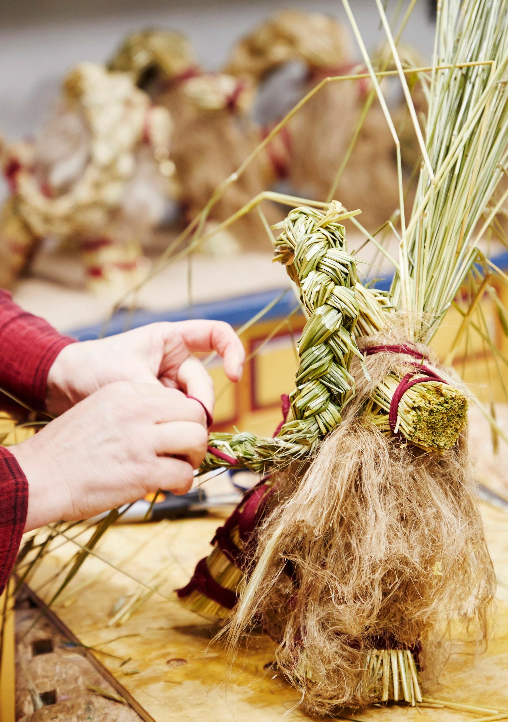 The straw at the front of the goat is also divided between the head and the front legs. Separate the front legs into bundles, tighten, and tie. Cut the legs evenly with the wool knife. Be precise so your goat stands straight and steady. Tighten and tie the goat’s neck. Add the beard and tie again.