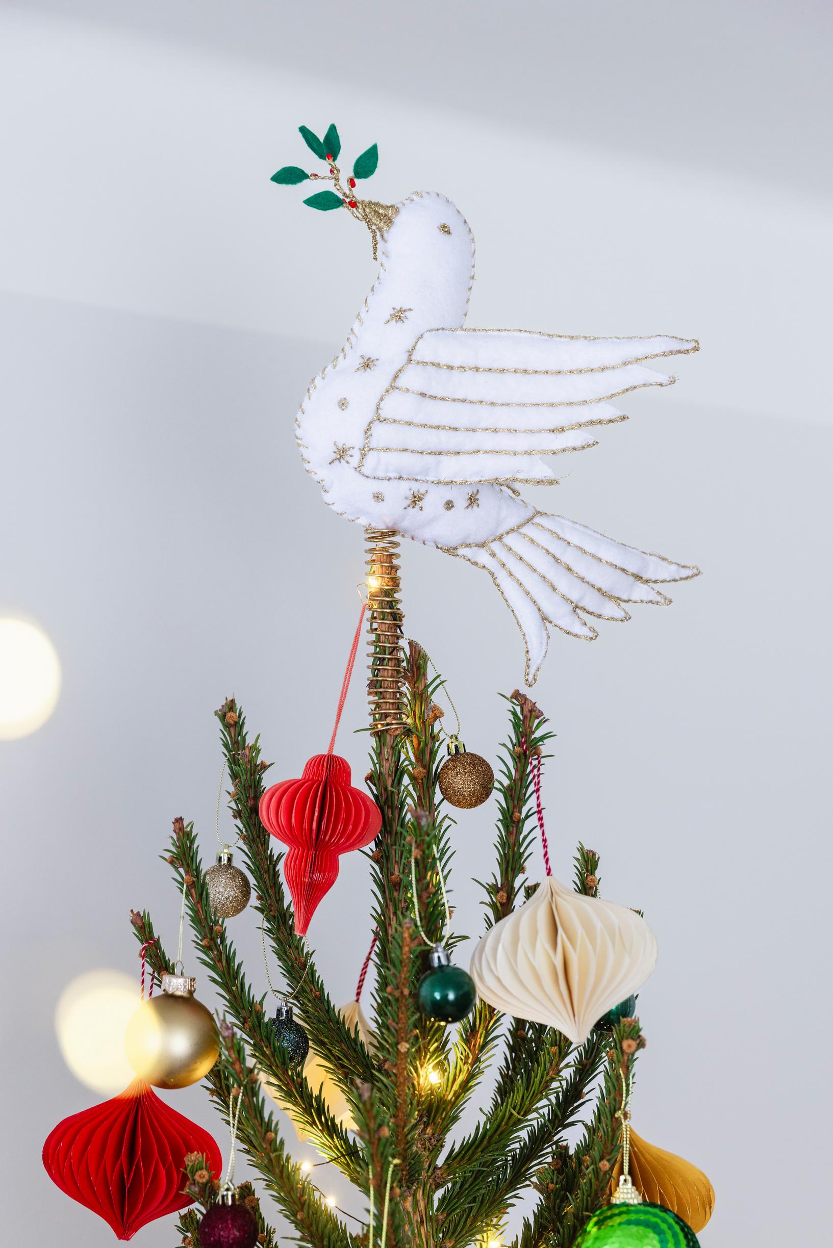 Felt, fiberfill, and sequins become a beautiful tree topper: a white dove that spreads its wings over the holidays. Hand-embroidered words or tiny beads make the bird uniquely yours.