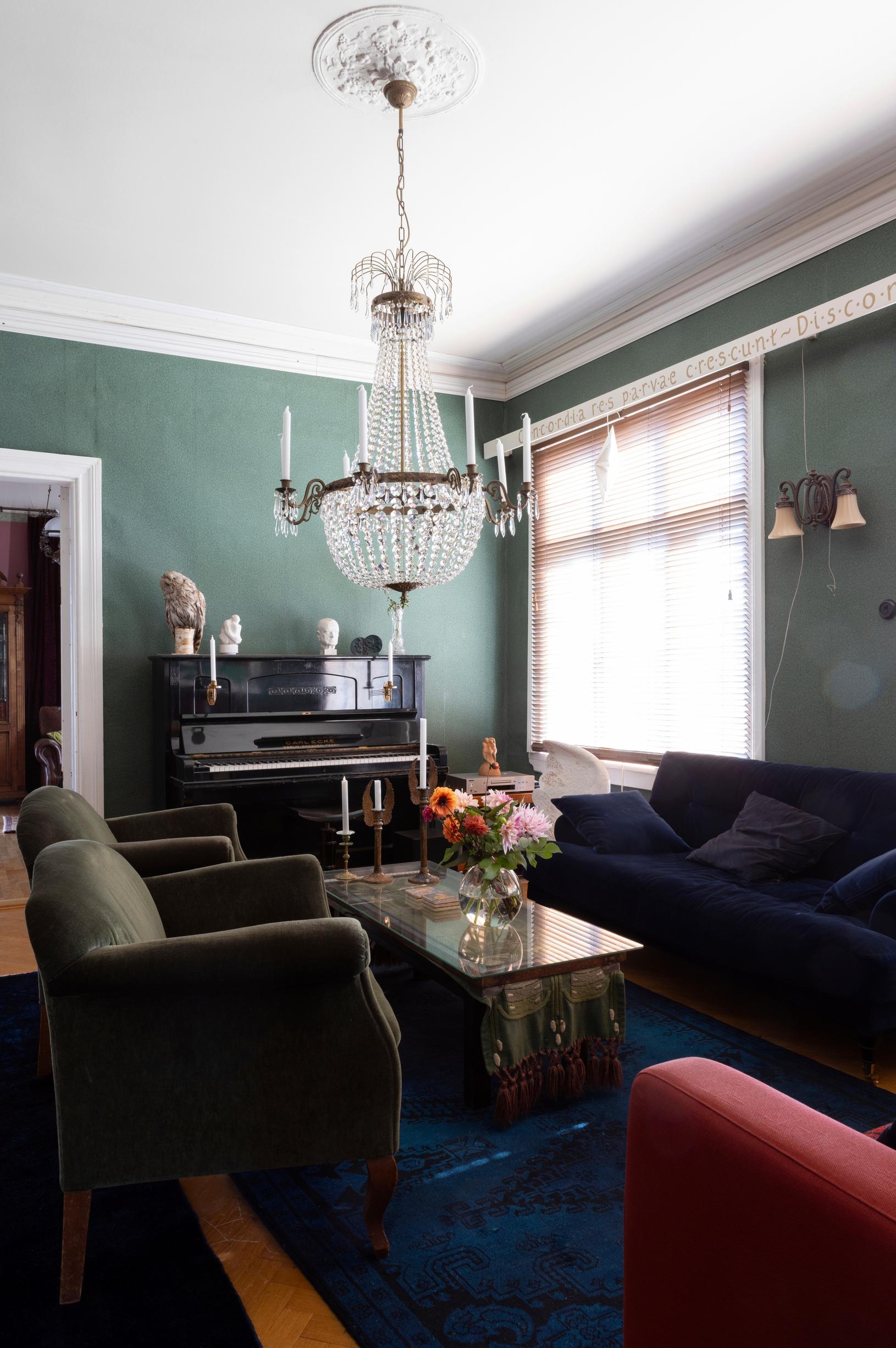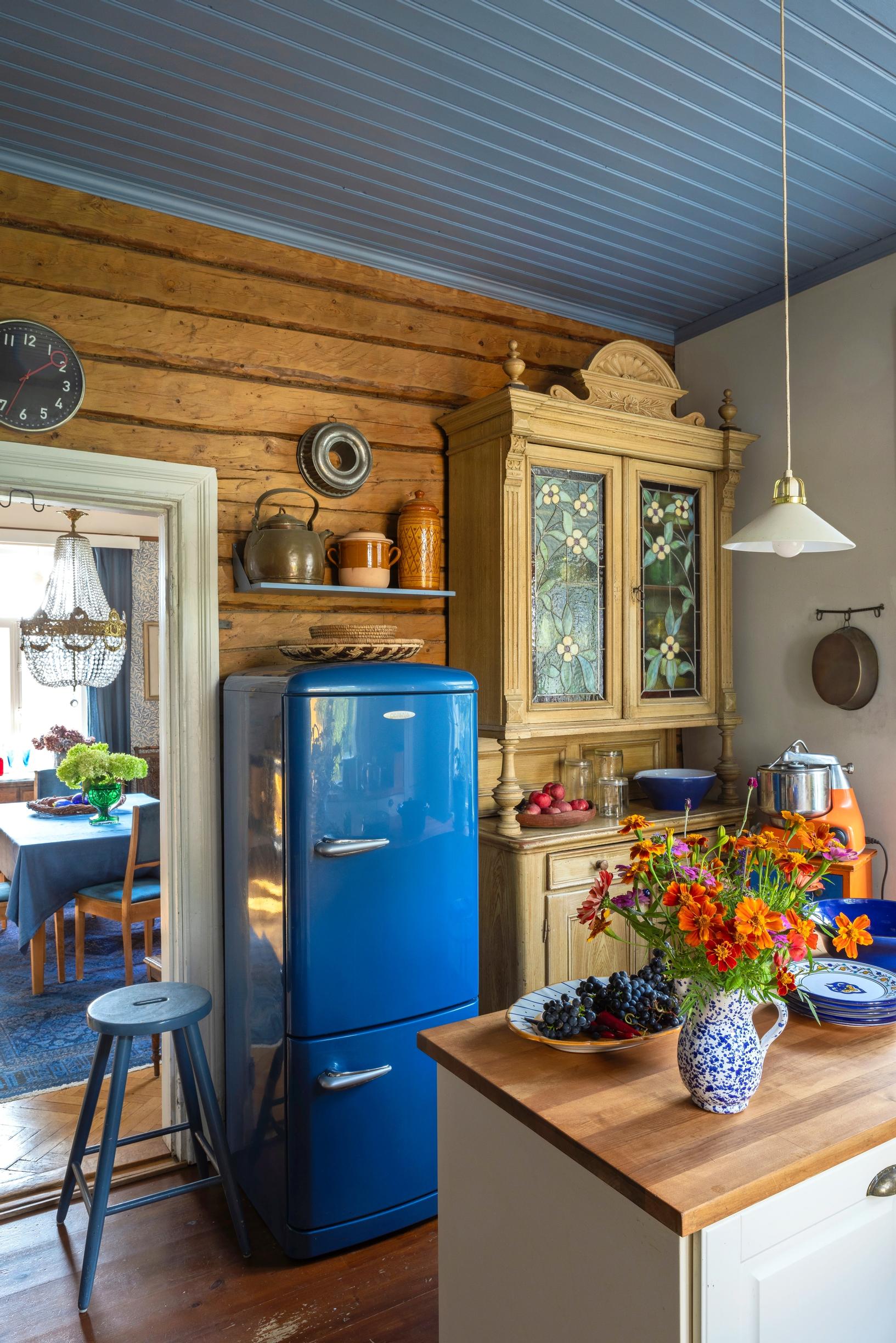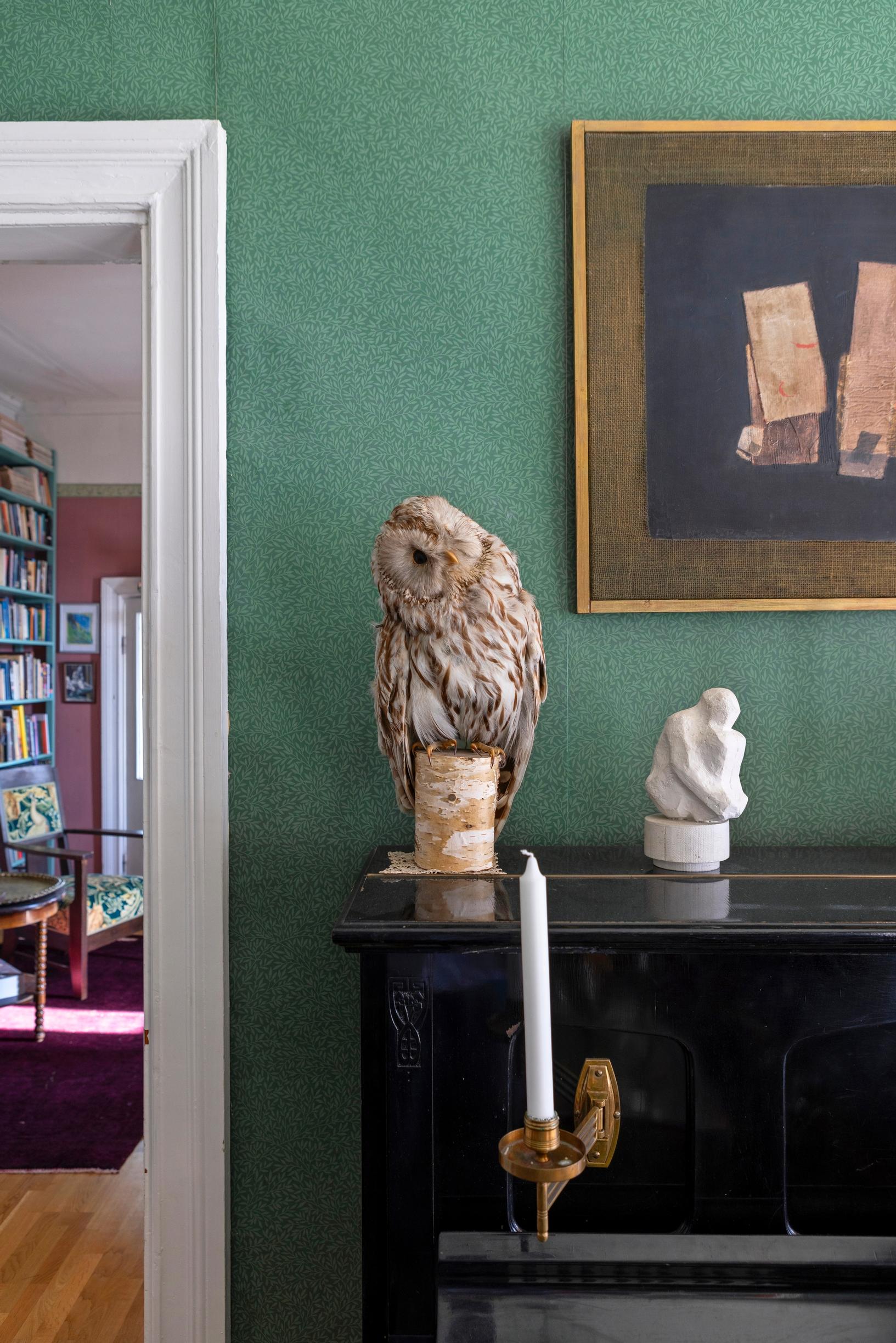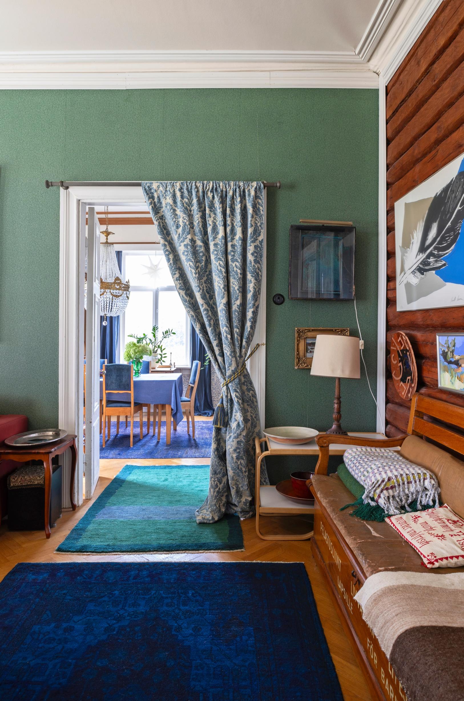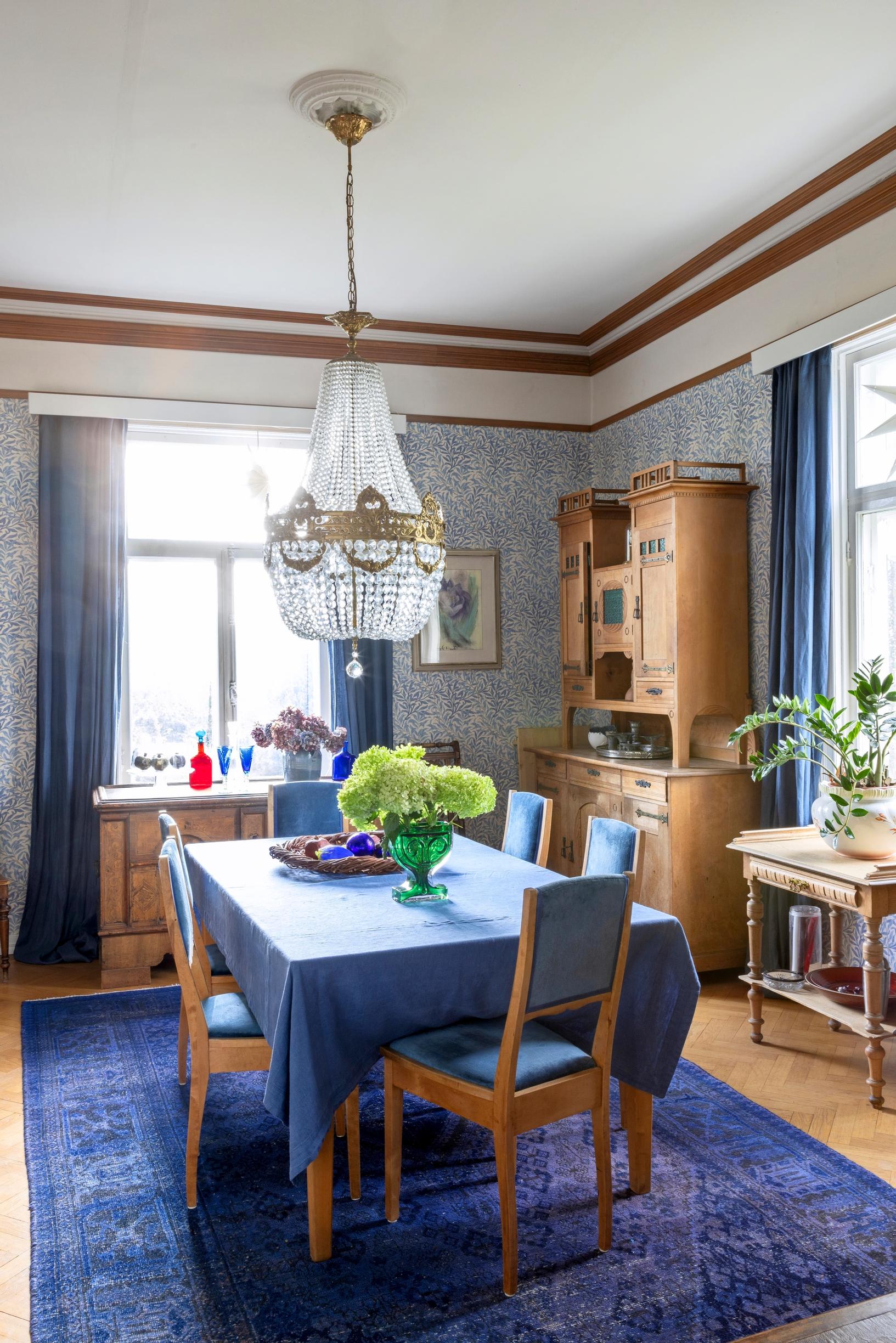 As you wander through the villa, you can’t help but be charmed by the unusually bold colors for a Finnish home: burgundy, cobalt blue, and emerald green. Sisko notes that these shades follow the décor trends popular in the late 19th century, when the house was built. In some rooms, she uncovered the old dark-wood paneled ceilings. Preserving the house’s heritage has been important to Sisko, which is why, for instance, every wallpaper is by William Morris’s, a key textile and wallpaper designer of that era.