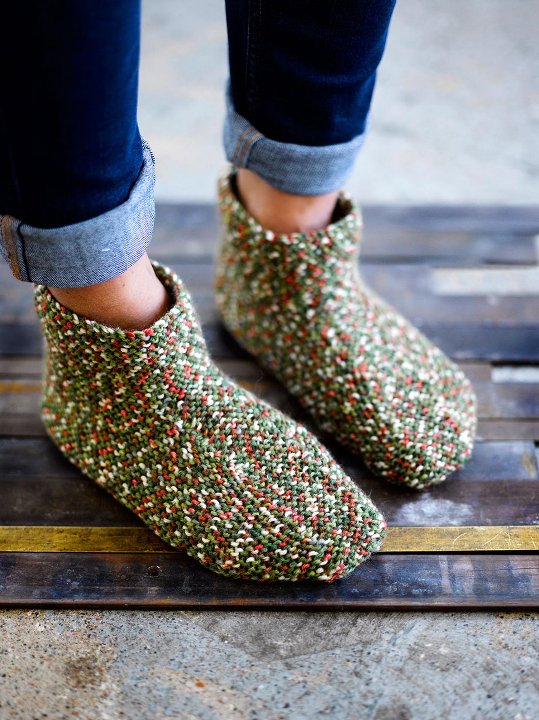 These adult-size knitted slippers work up quickly in garter stitch with just one skein of sock yarn. Follow our pattern to make a cozy pair for both women and men.
