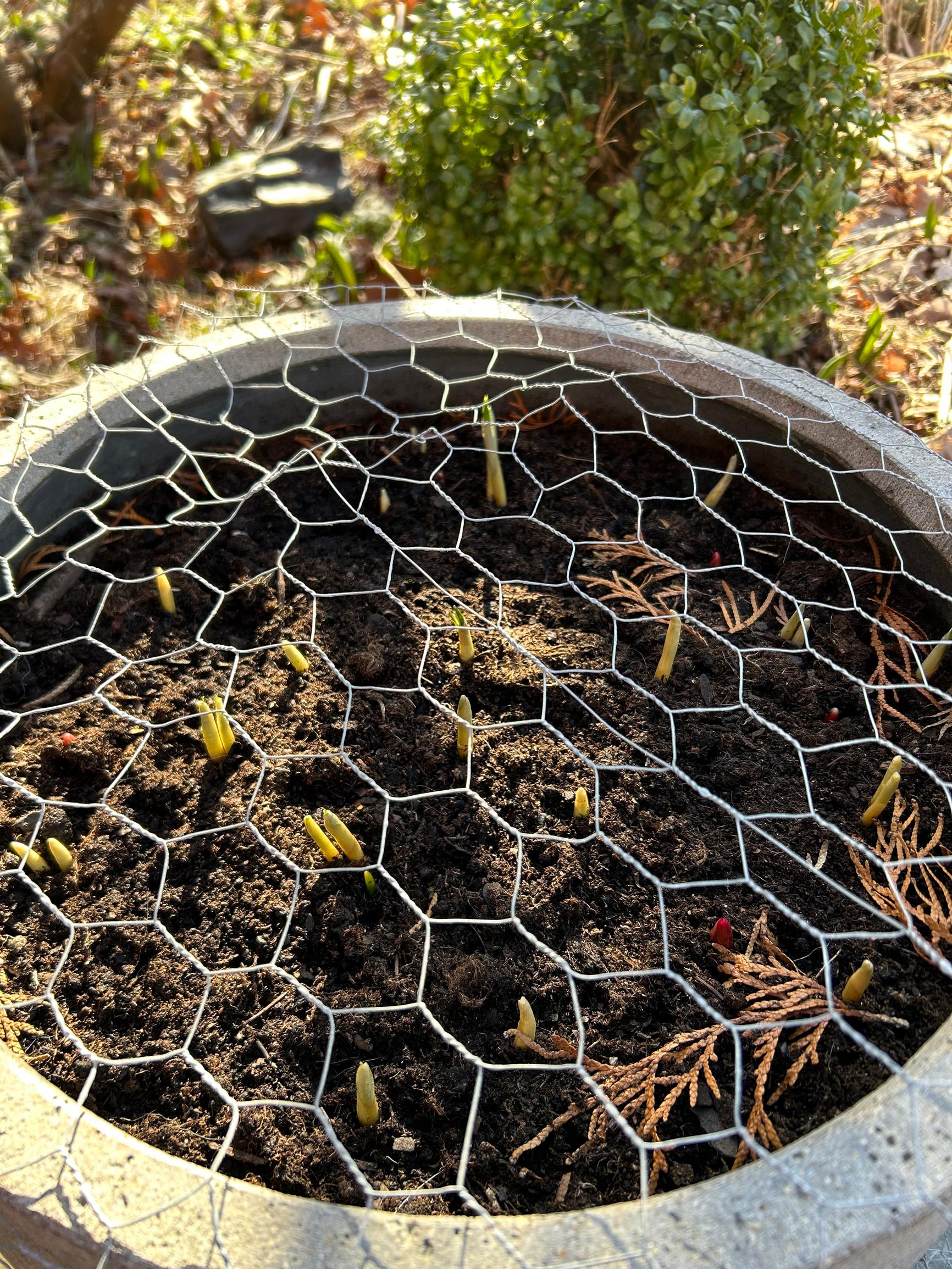 The third pot was kept outdoors against the house wall. Because excess moisture is hard on bulbs, this frost-proof container stayed on a covered terrace. It wasn’t watered all winter and was covered with mesh to keep animals away. The winter of 2024–2025 was mild, but during the coldest spell, the pot got covered with a coat.