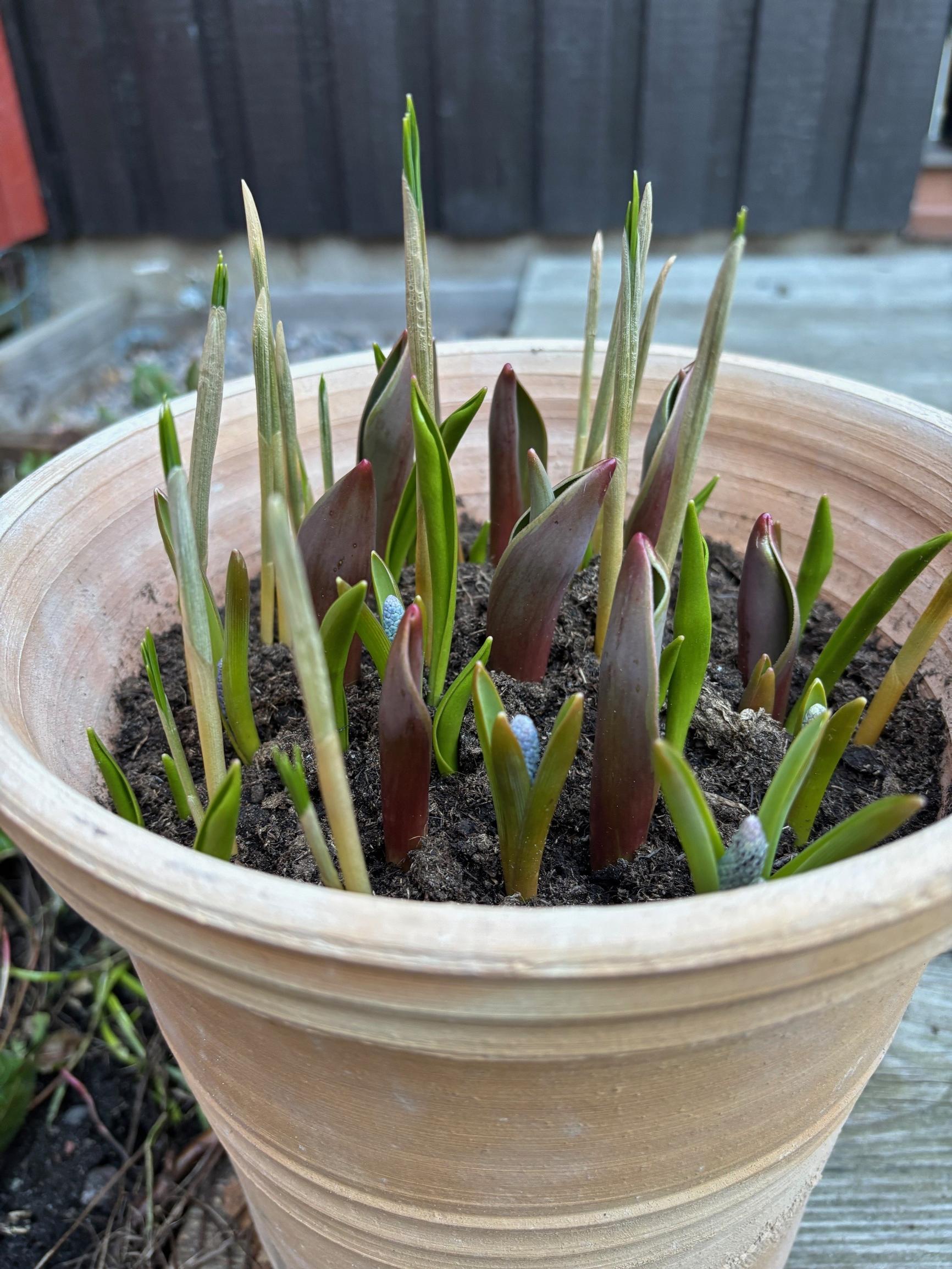 On the glazed balcony pot, tiny shoots appeared by mid-March.
