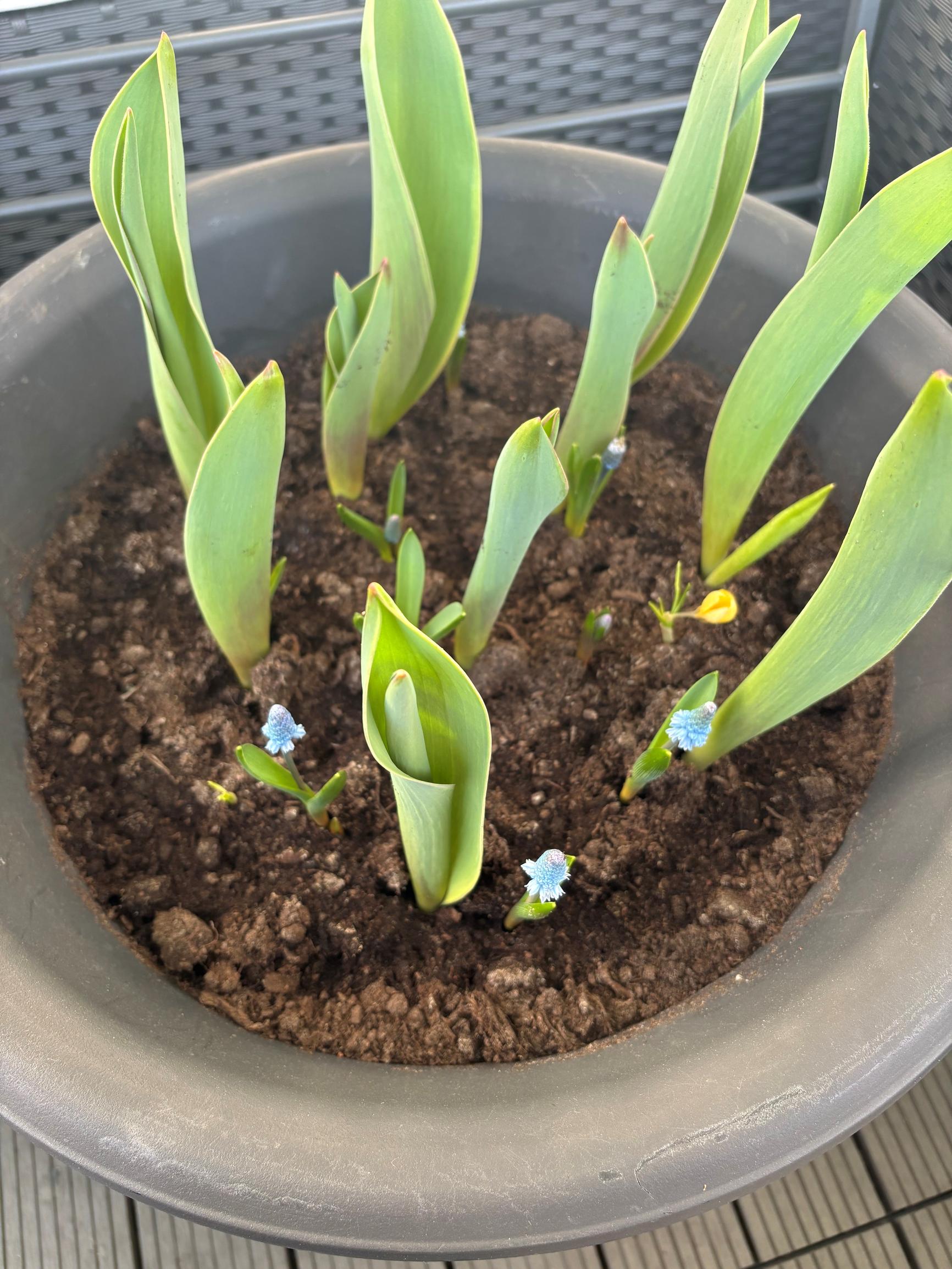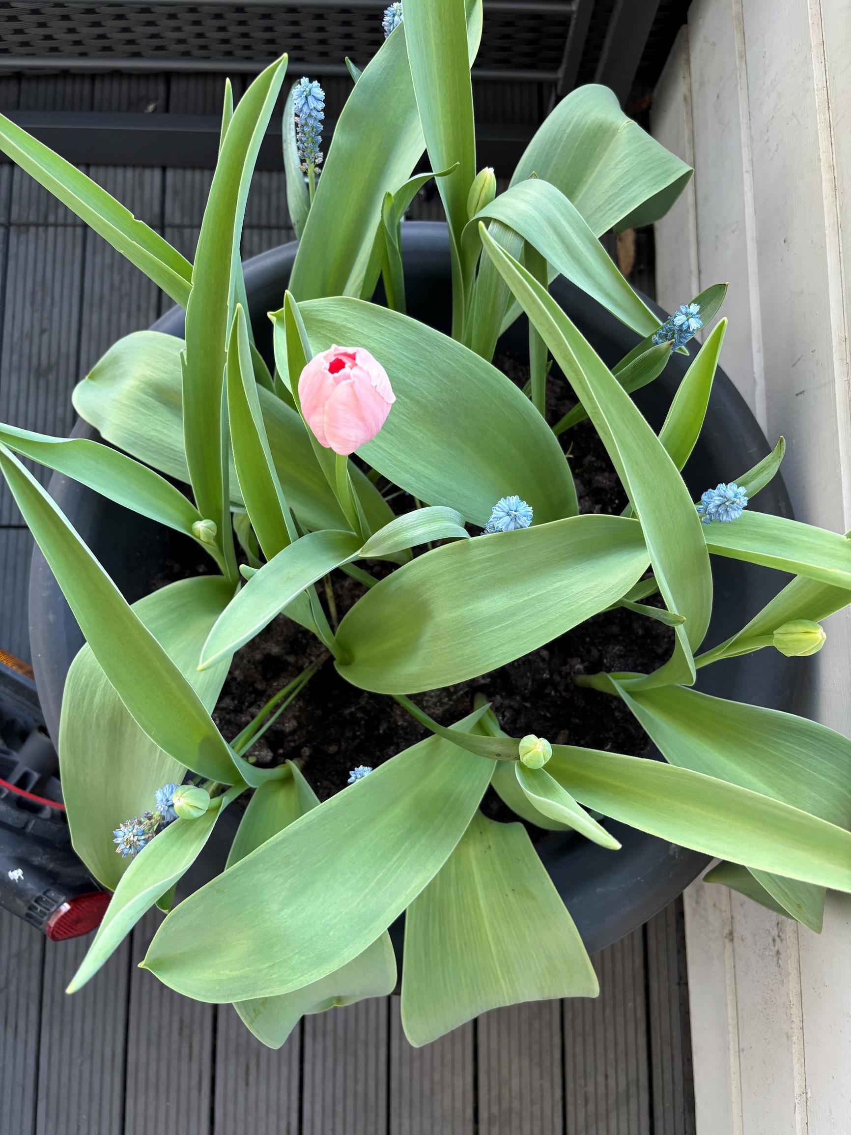 In the balcony pot the first sign of spring arrived in early April, when grape hyacinths and crocuses opened their buds. After that, the tulip leaves covered the smaller bulbs below. Several lilac tulips bloomed, but only one of the larger Darwin hybrids produced a flower.