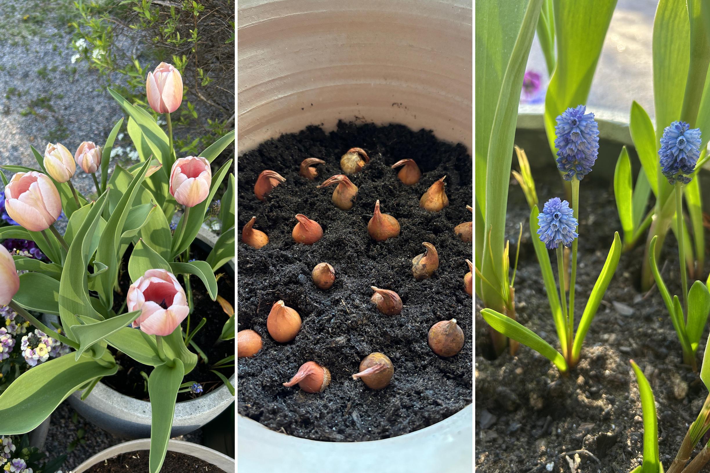 The chosen varieties were saffron crocus “Romance,” grape hyacinth, the lilac tulip “Lilac Wonder,” and the Darwin hybrid tulip “Salmon Impression.” The idea was to make a layered “lasagna” planting, where crocuses and grape hyacinths would flower fairly early in spring, followed by the more delicate lilac tulips and the bigger Darwin hybrids.