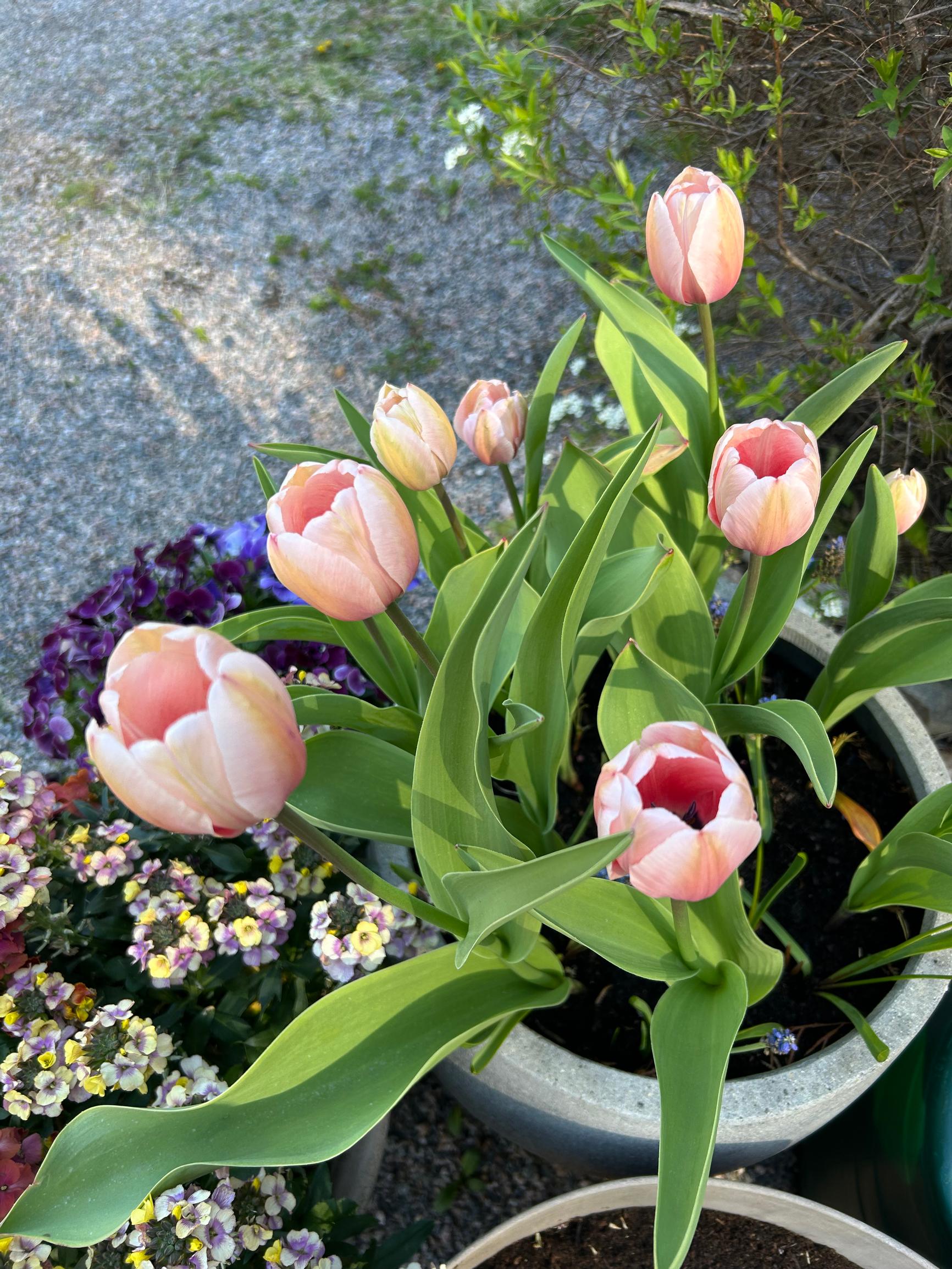 In the pot that spent winter outdoors, only a few crocuses flowered. Grape hyacinths opened around mid-April, but the middle-layer lilac tulips were nowhere to be seen. Instead, the Darwin hybrids bloomed beautifully in this pot, though somewhat late. In the same garden, some tulips planted in the ground had already finished blooming.