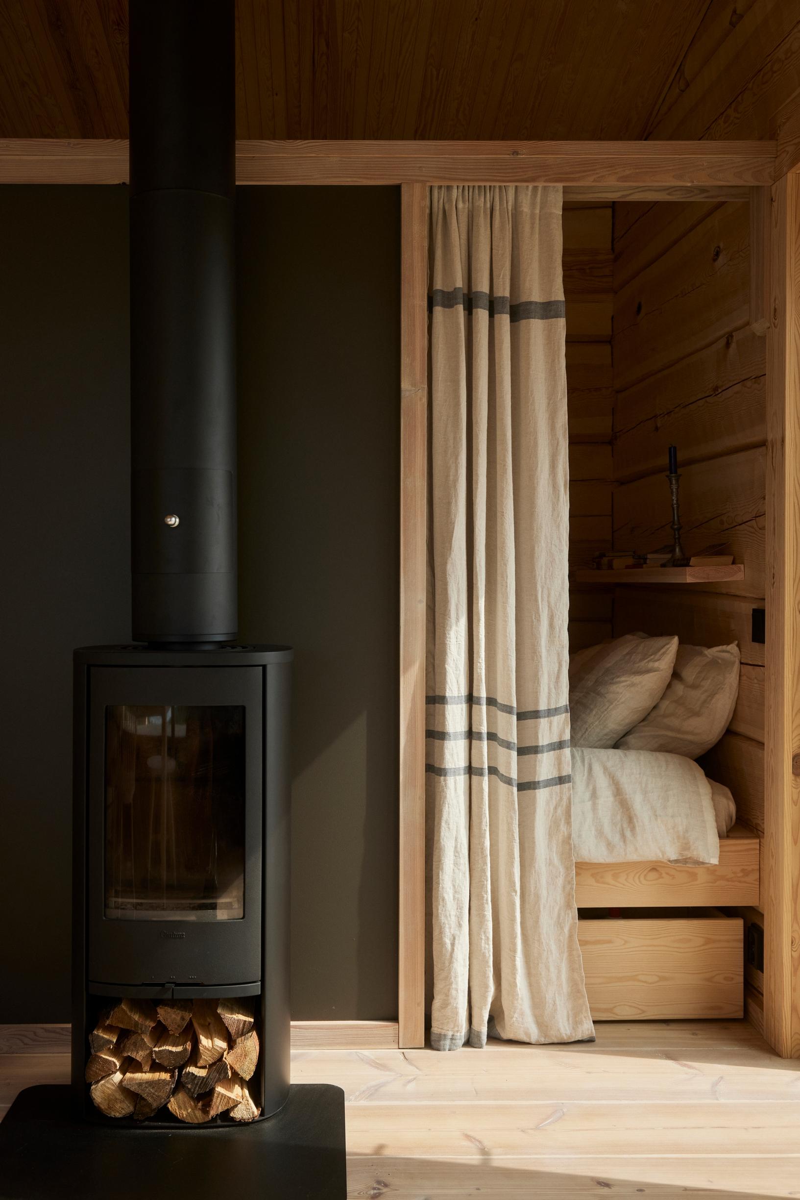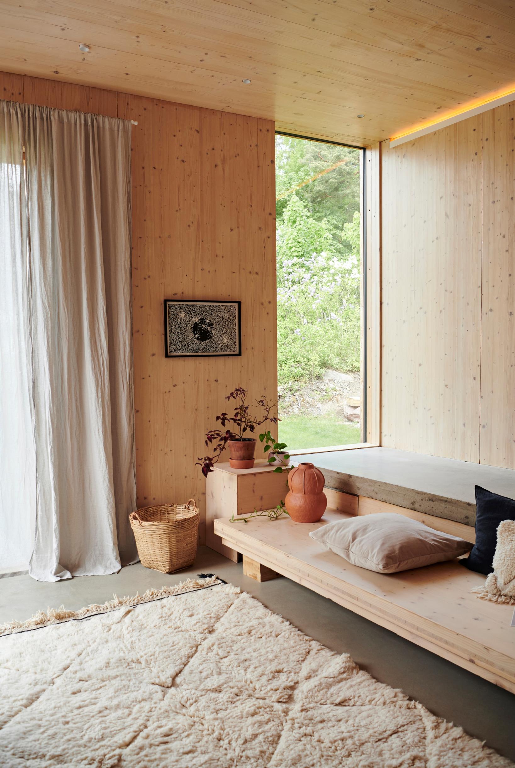 Sikke Sumari built a modern, minimalist living area in the sauna cabin on her island property, with a bed intended for resting and reading, as the family stays in nearby dwellings. “It’s wonderful to light the fireplace for atmosphere while reading and just sit there admiring the sea,” Sikke says. The decor features natural wood and linen textiles.