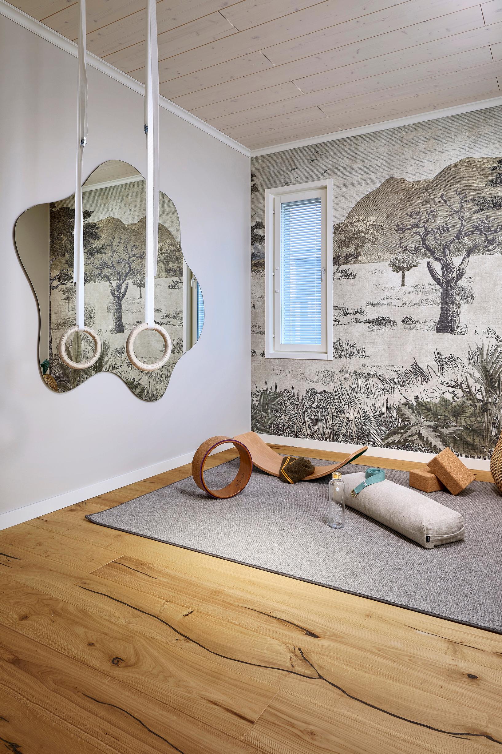 Not sure what to do with a child’s room after they move out or an idle community room in your building? Turn it into a wellness sanctuary. Start by clearing it out and painting or wallpapering the walls in calming tones. The simplest approach might be just adding a mirror and a couple of body-care essentials. Wooden wall bars and a medium-height wooden cabinet add both warmth and practical storage. Boråstapeter’s Serengeti wallpaper can help ease a busy mind.