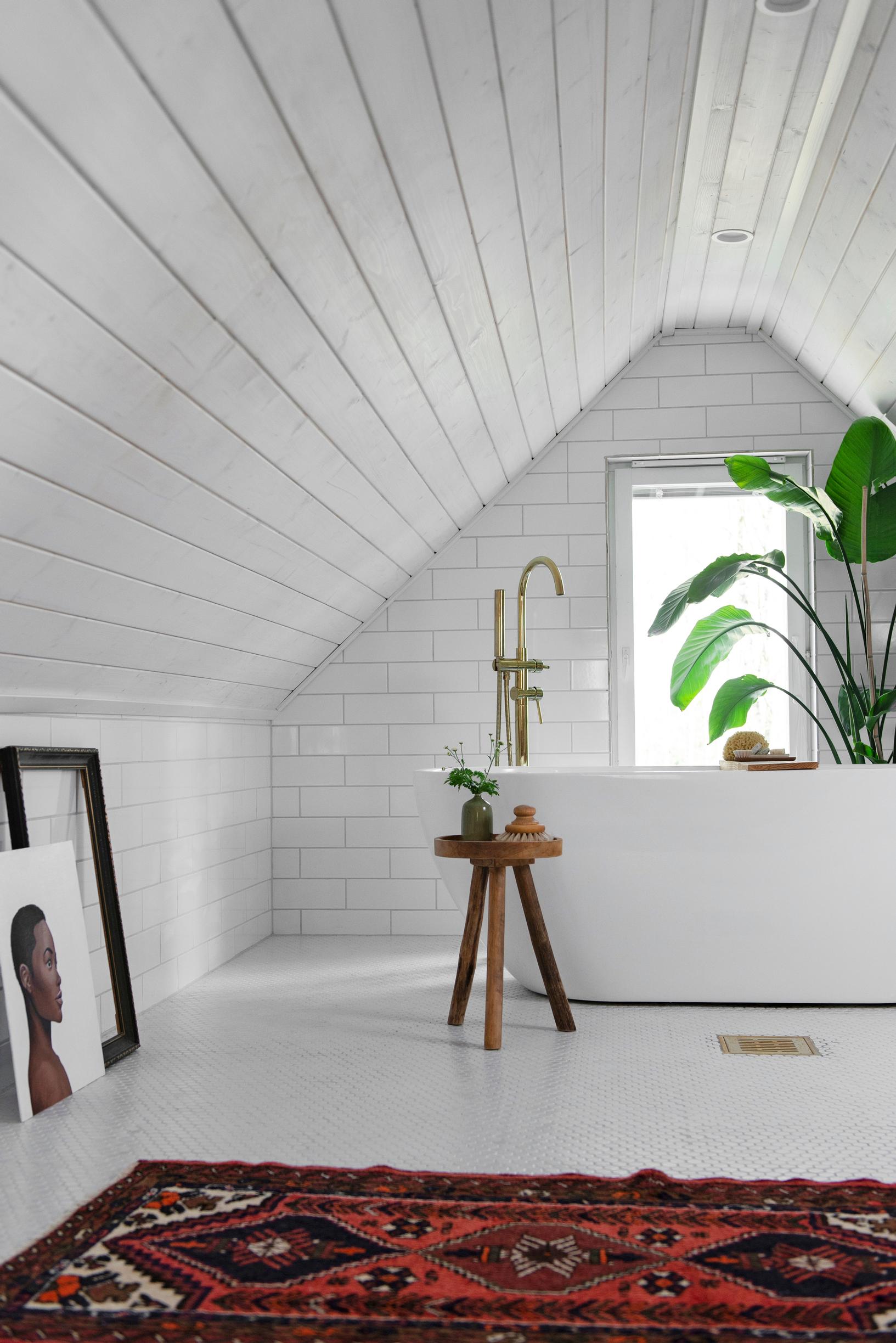 Is a warm bath your favorite way to relax? While renovating an old log cabin, the owners turned one end of the attic into a stunning home spa—after careful load-bearing checks. The small gable windows were replaced with larger ones to let in more natural light. This airy space needs little else beyond a large houseplant and a colorful rug.