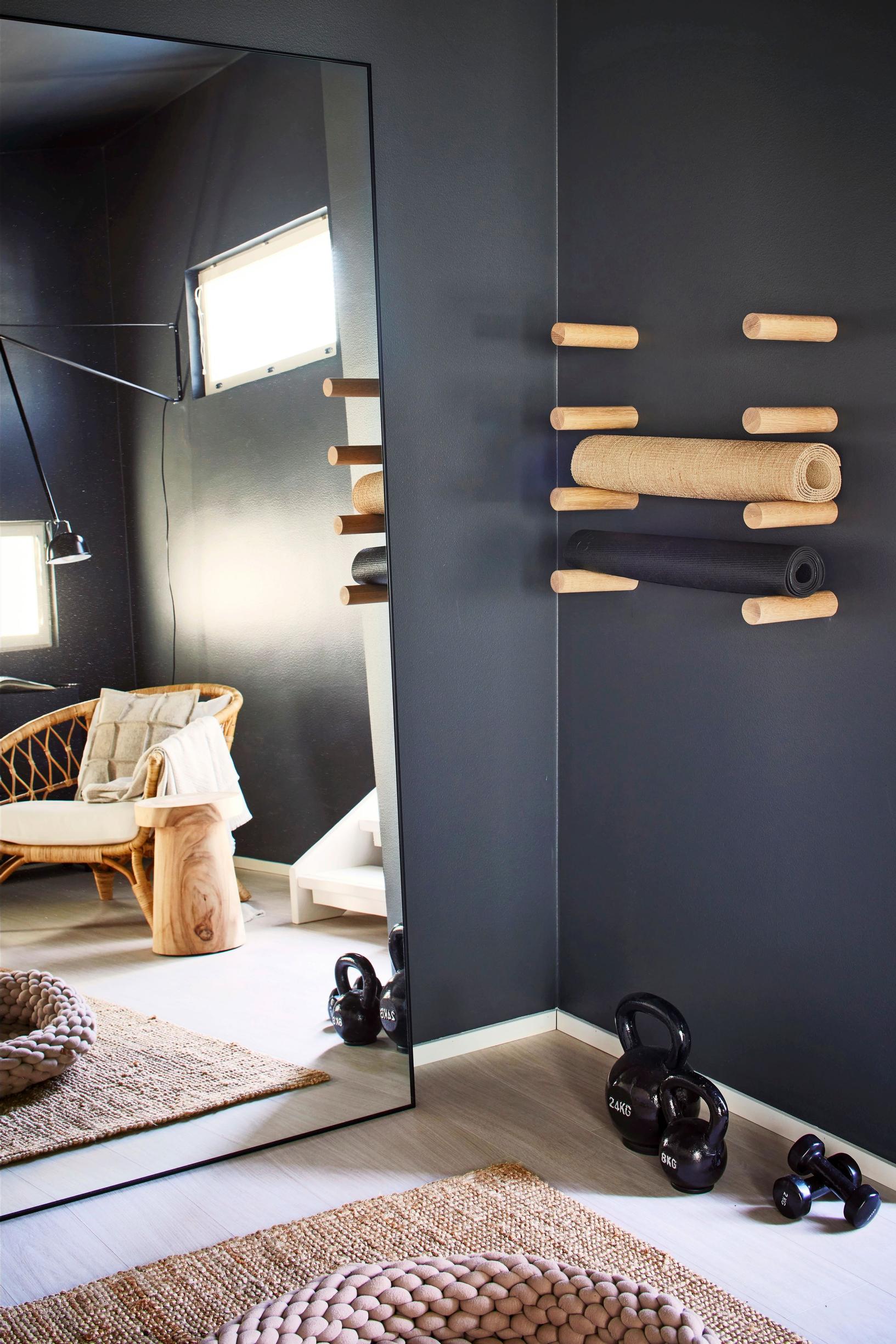 Could you clear a corner of your bedroom for yoga or quiet reflection? A dark graphite-gray tone on the walls and ceiling brings calm, offset by a pale birch-paneled wall. Custom-made wooden pegs hold your yoga mats neatly on the wall.