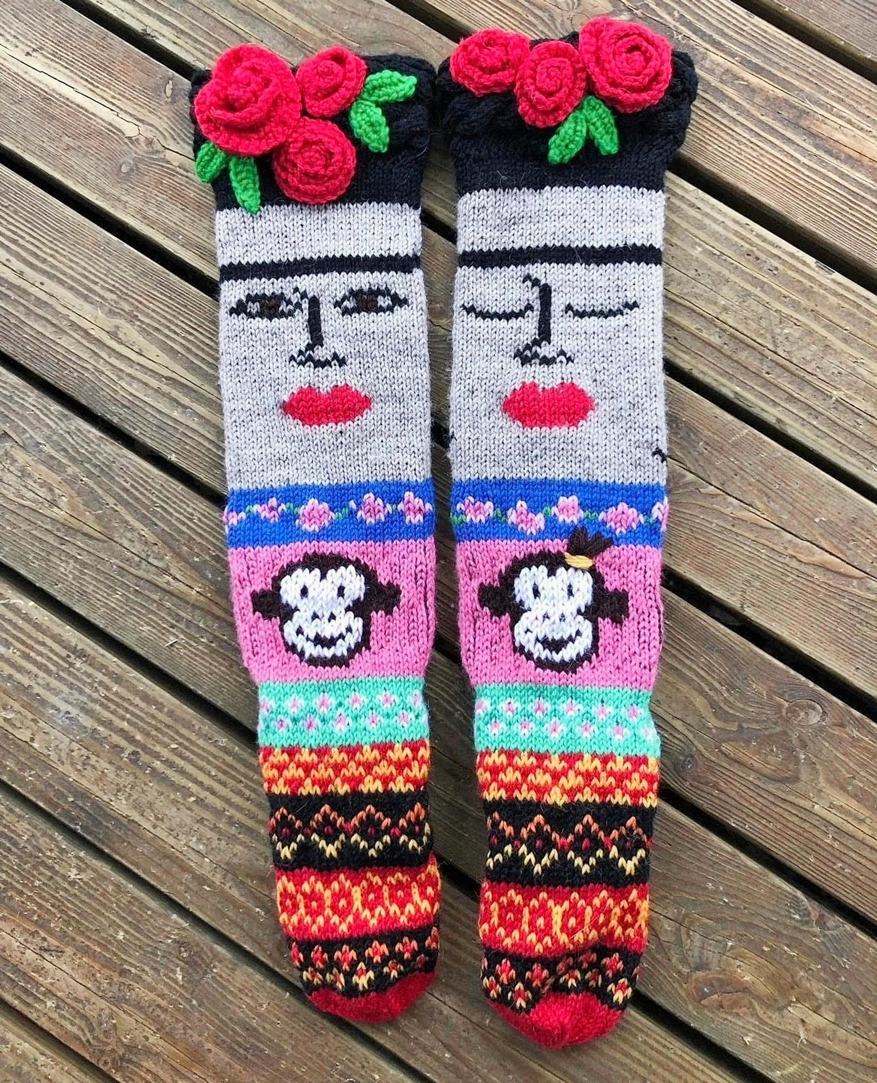 I knitted the Frida socks at a friend’s request. I remember being in a bubble of happiness while making them, because it was so wonderful to start exploring Frida Kahlo and think about what parts of her life to translate into the socks. I looked online and in books at what she wore and what pets she had. The gaze was the most important: Frida’s gaze was brazen and feminine, wild and free—everything I craved in my own life. Just realizing I could work Frida’s crown braid into the ribbing was delightful.